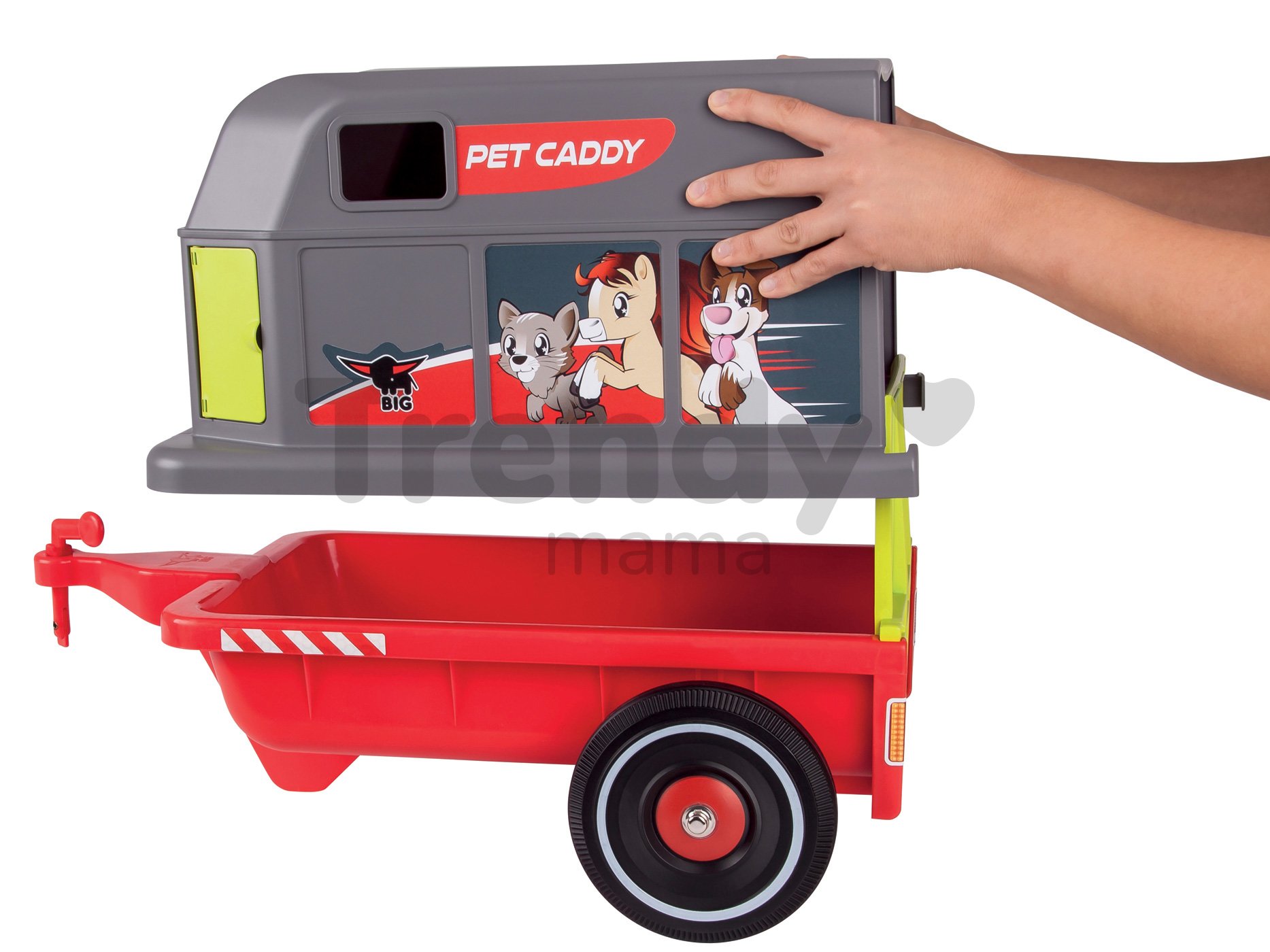 Přívěsný vozík Bobby Pet Caddy je fantastický doplněk k odrážedlům BIG z kolekce Classic, New a Scooter. V přívěsu je dostatek místa pro nejoblíbenější hračky malých řidičů. Díky integrovanému stojanu je přívěs stabilní. Má kapacitu 25 kg a dá se jednoduše napojit na kterékoliv odrážedlo BIG pomocí jistícího čepu. Výhodou tohoto dětského přívěsu je odpojitelná vrchní část, takže krytý přívěs se jednoduše změní na klasický přívěsný vozík. Do vozíku bez stříšky se pak dá naložit i objemnější náklad. přívěsný vozík je vhodný pro děti od 12 měsíců.