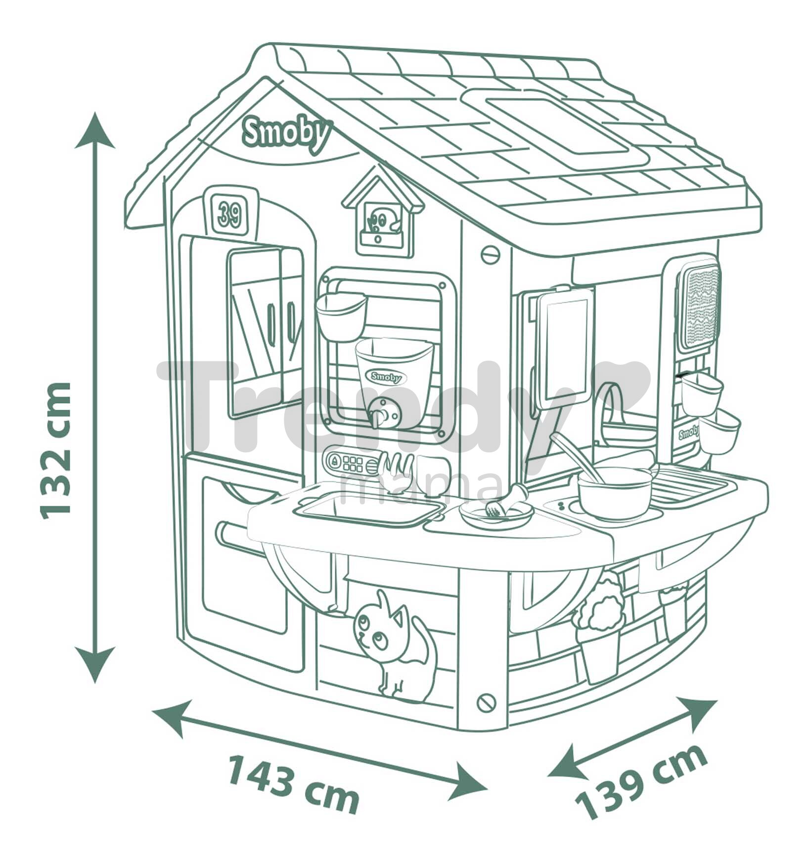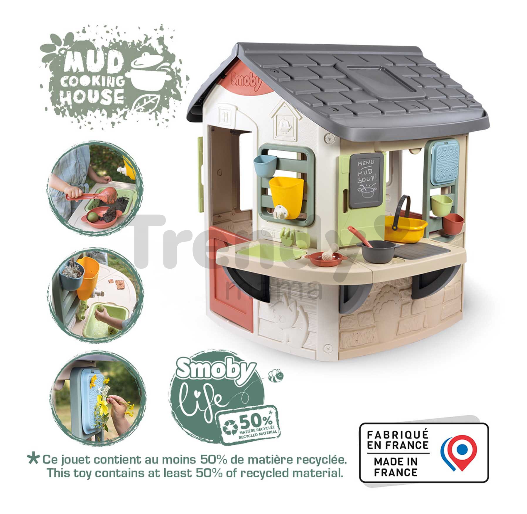 Domeček s pracovním pultem Mud Cooking House od francouzského výrobce Smoby přinese chlapcům a dívkám od 2 let krásné zážitky při každodenní hře. Dětský domeček působí realisticky, povrch má tvarovaný do reliéfu s podobou cihel a dřeva. Je vybaven 2 polovičními dveřmi s otvorem na dopisy od pošťáka a 2 okny s otevíracími okenicemi, díky čemuž mají děti uvnitř příjemný vánek i během horkých letních dní. Z venkovní strany domečku na děti čeká pracovní pult pro zahradníka se 16 doplňky, na které budou realizovat své kreativní nápady při hře s trávou, zeminou, bylinkami a květinami.
