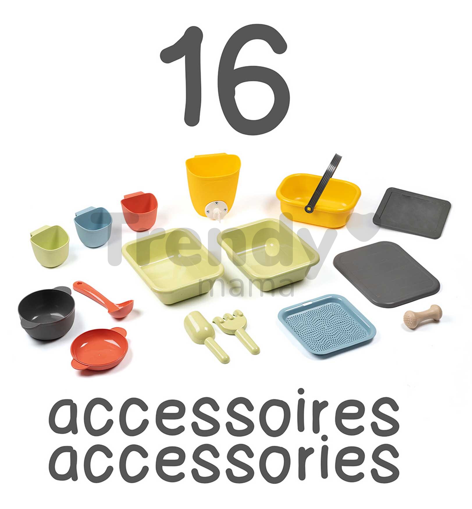 Nad pultem se nachází funkční nádržka na vodu s kohoutkem, pomocí které si děti mohou napustit do nádoby potřebné množství vody. Ve výbavě je také nádobka s hmoždířem na drcení bylin, 3 závěsné boxy, hrnec s naběračkou, talířek, košík na sběr bylinek, sítko s dírkami pro stonky květin a hrábě s lopatkou. Pracovní pult umožní dětem vytvářet kreativní výtvory se vším, co nabídne vaše zahrada – učí se pracovat s pískem, zeminou, květinami, formují mokrý písek, zeminu a vytvářejí různé ozdoby. Potěší je také šedá tabulka, na kterou si mohou křídou napsat různá oznámení a nakreslit jednoduchý obrázek.