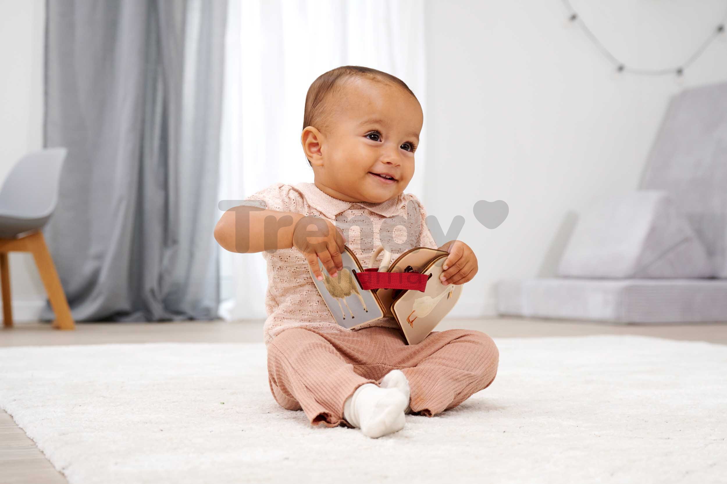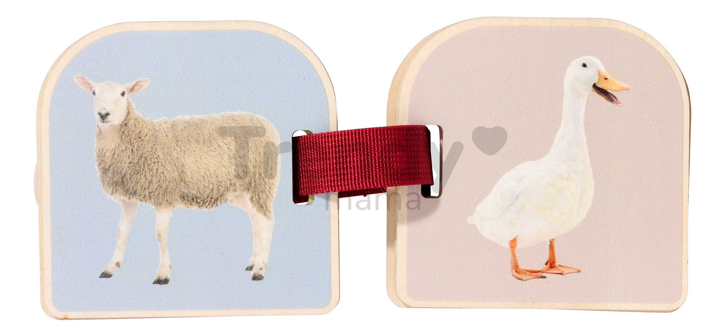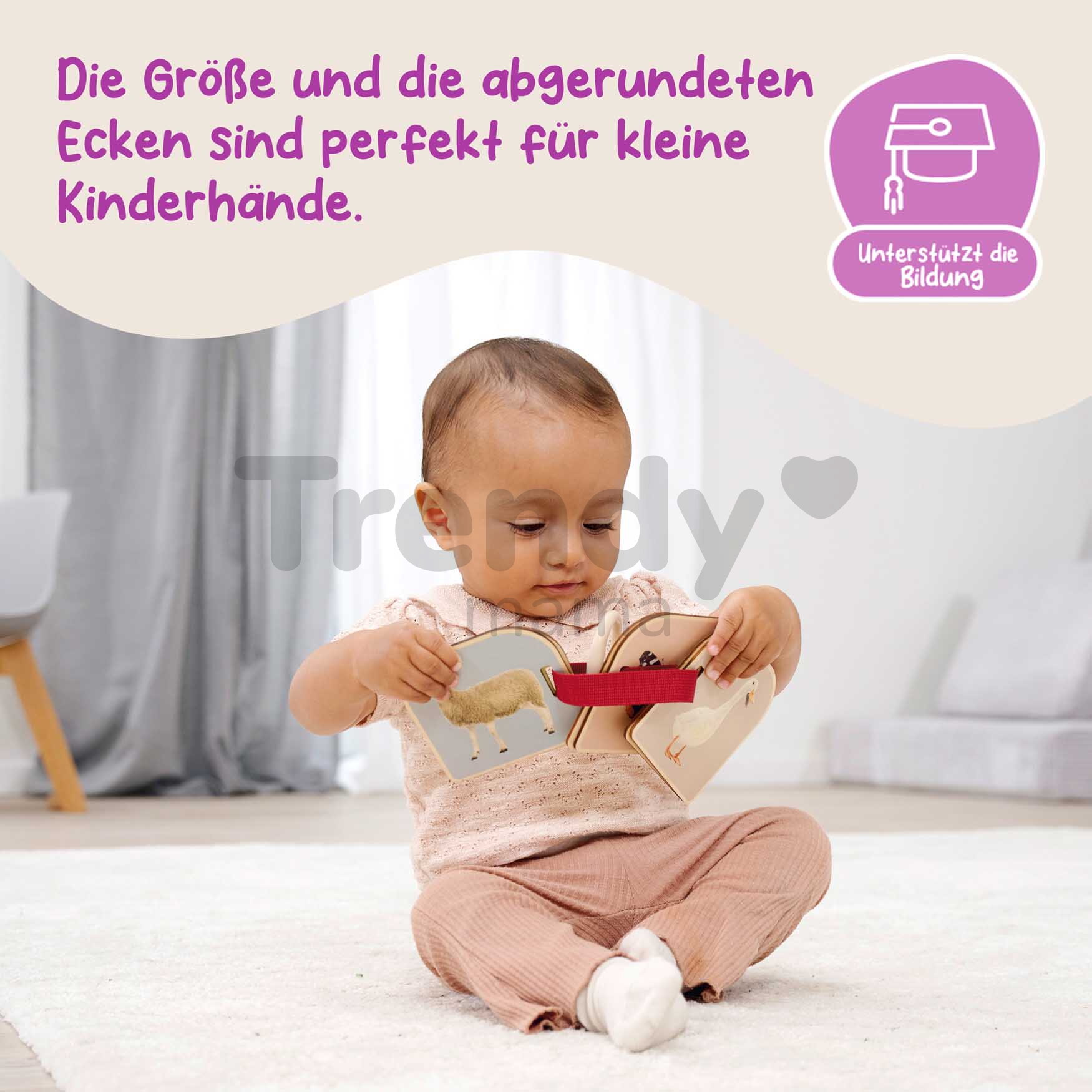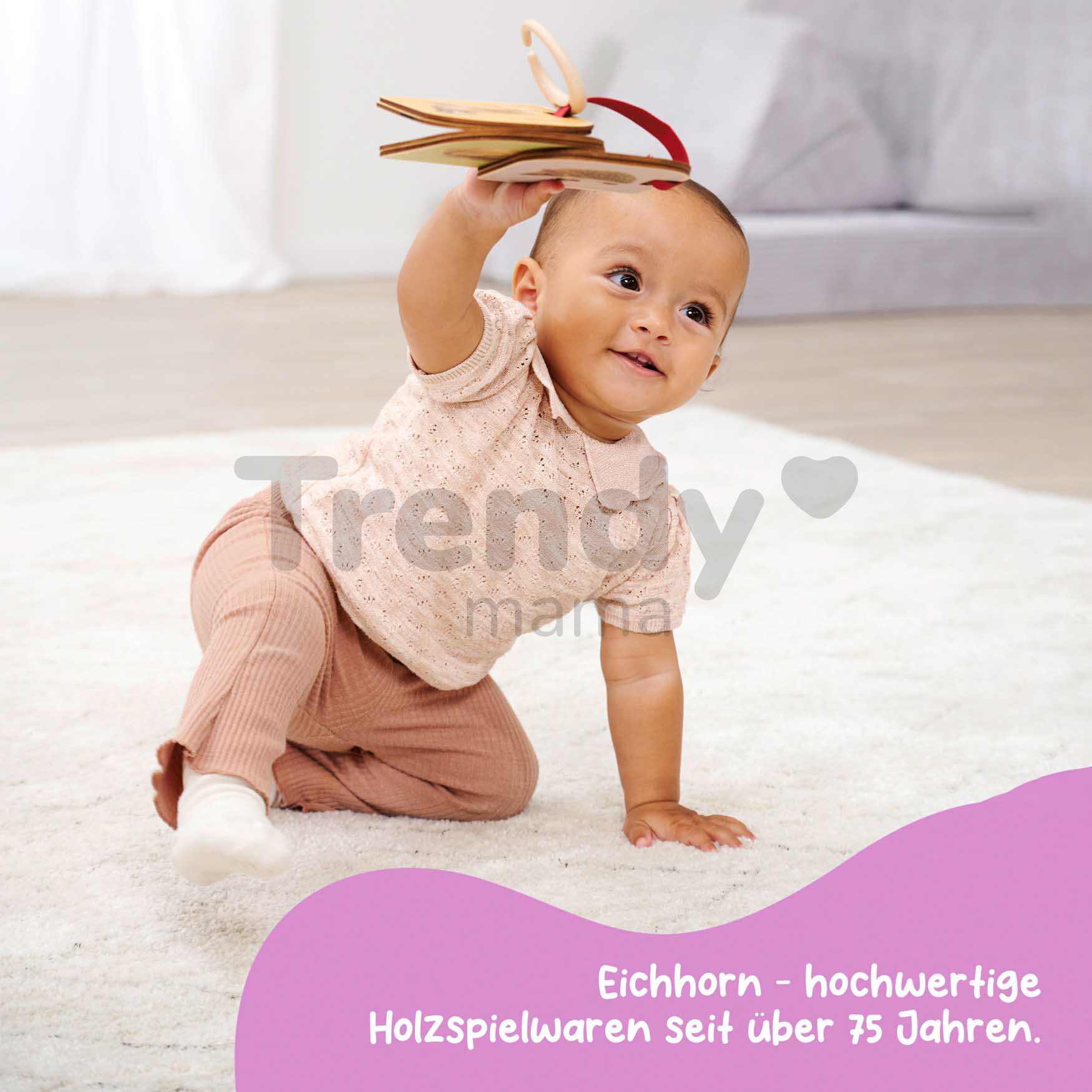 Kvalitní dřevěné hračky Montessori od německé značky Eichhorn. Dřevěná obrázková knížka s upevněním na kočárek okouzlí miminka od 12 měsíců s obrázky zvířátek.