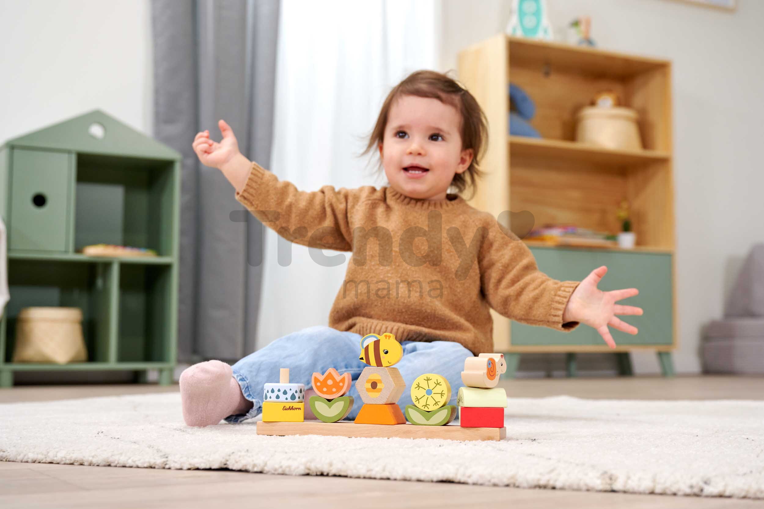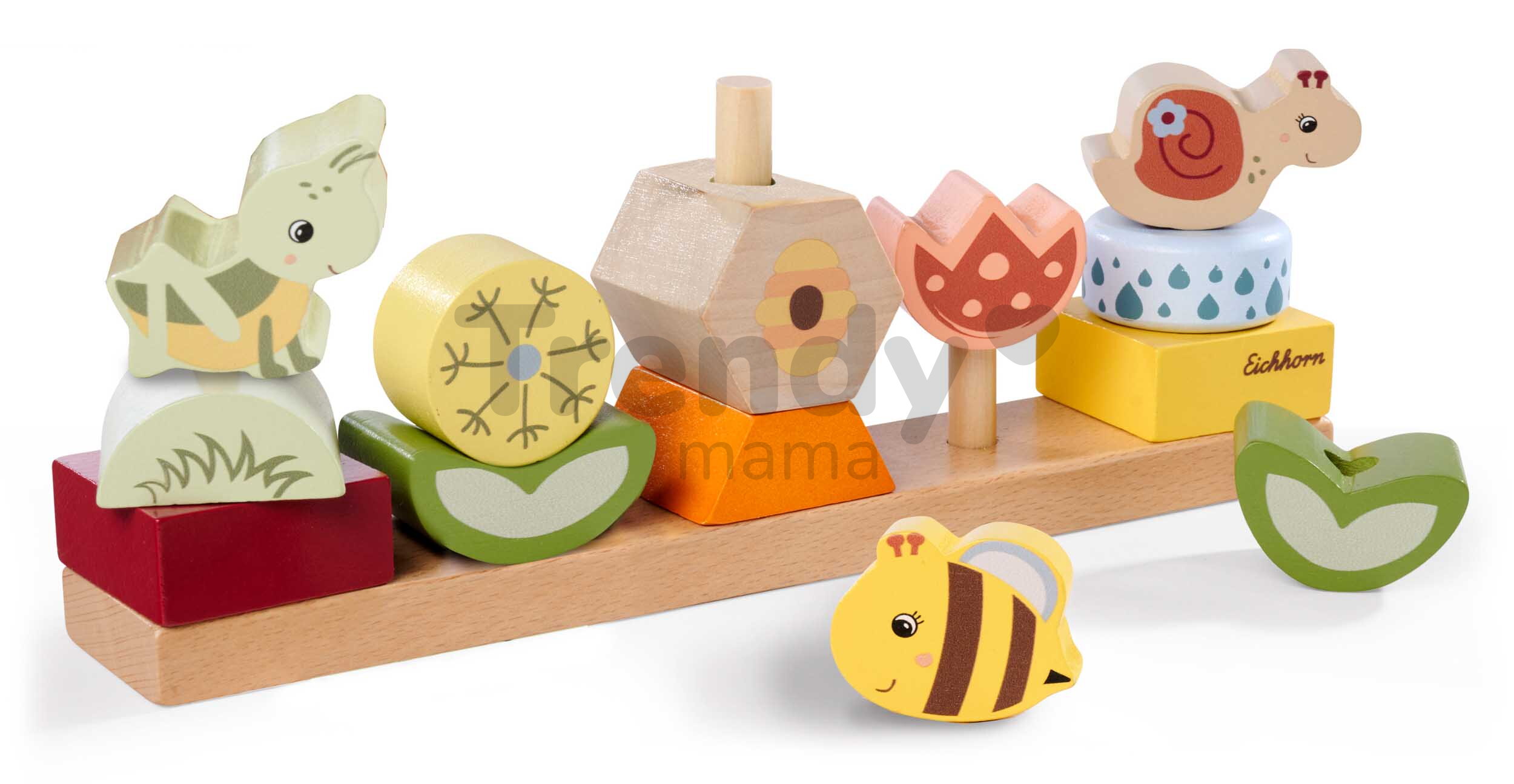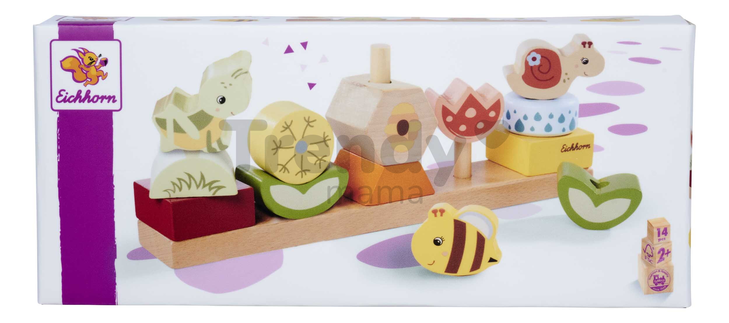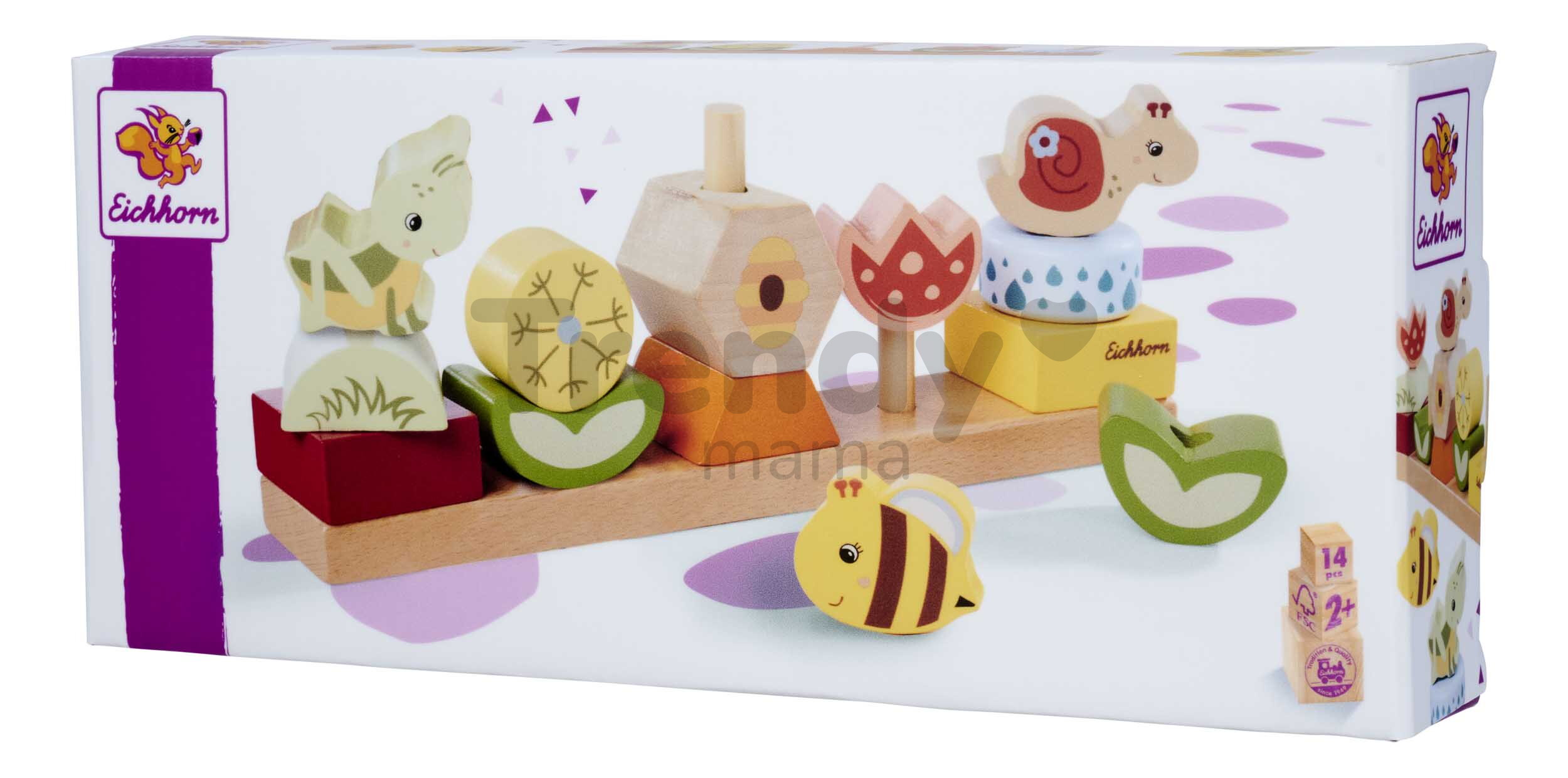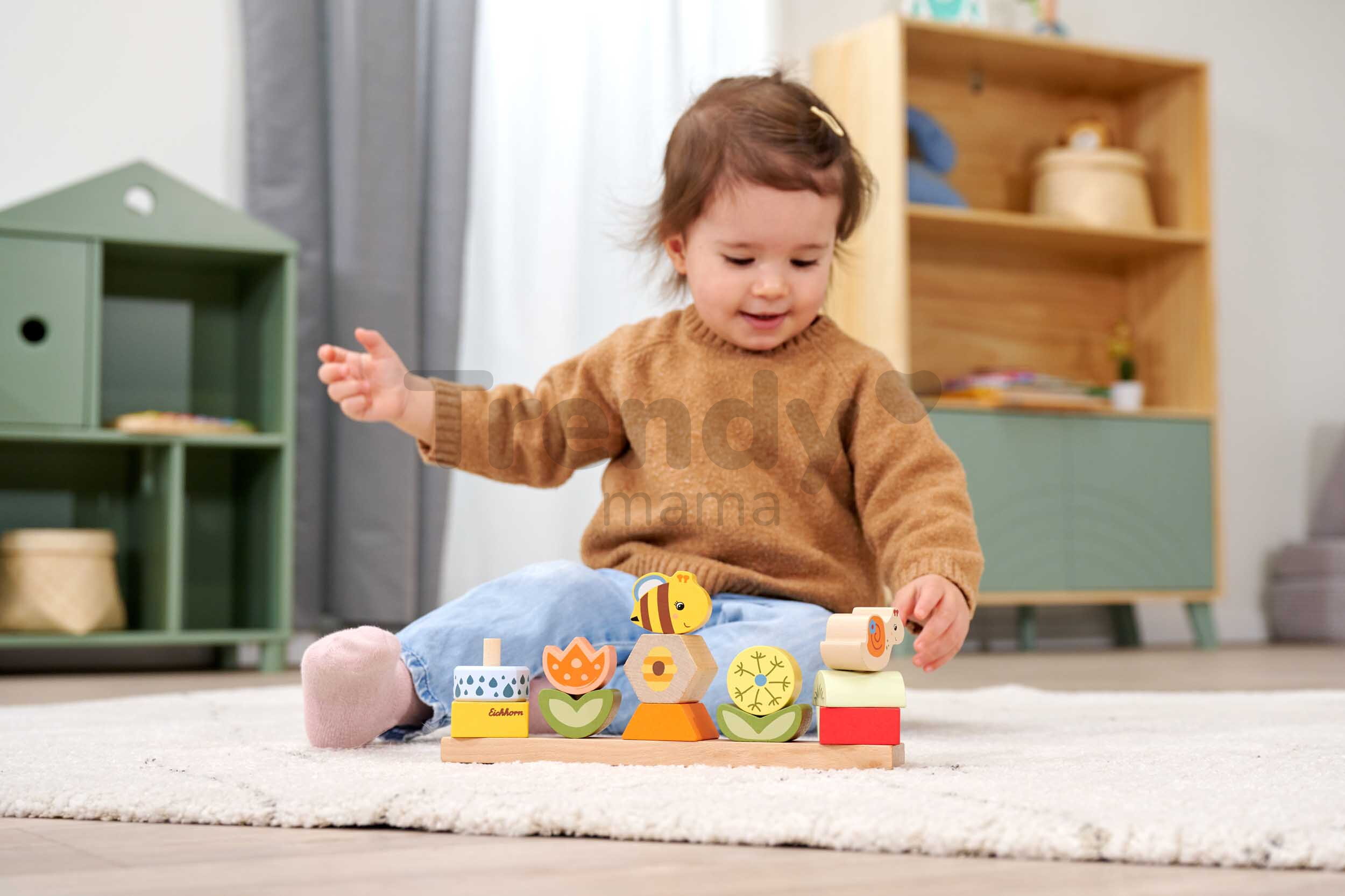 Špičkové dřevěné hračky pro kluky a holky od 2 let přináší značka Eichhorn. Dřevěná skládačka s motivem Květiny a zvířátka obsahuje 13 stohovatelných kostek s podstavcem.
