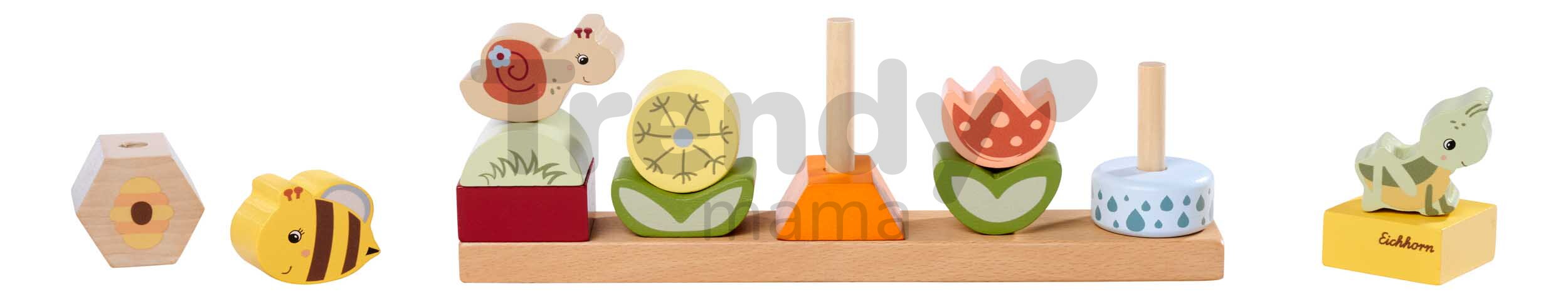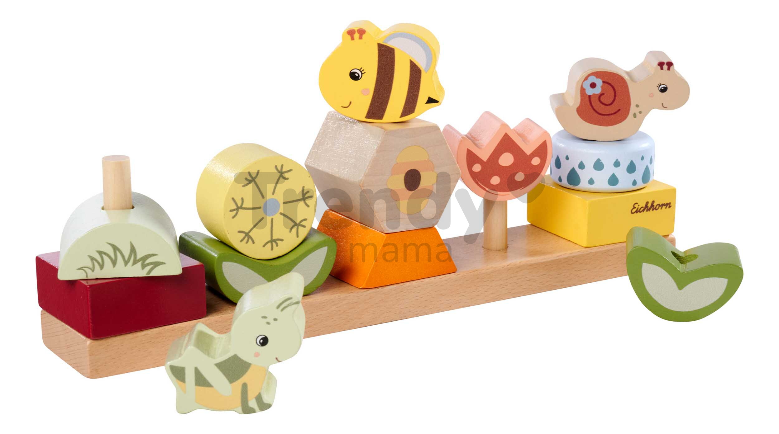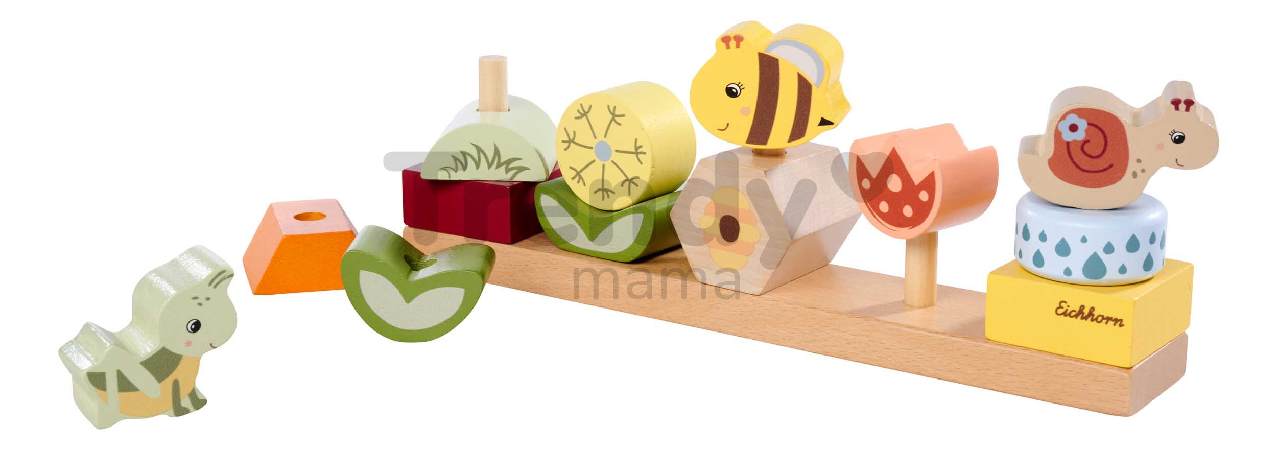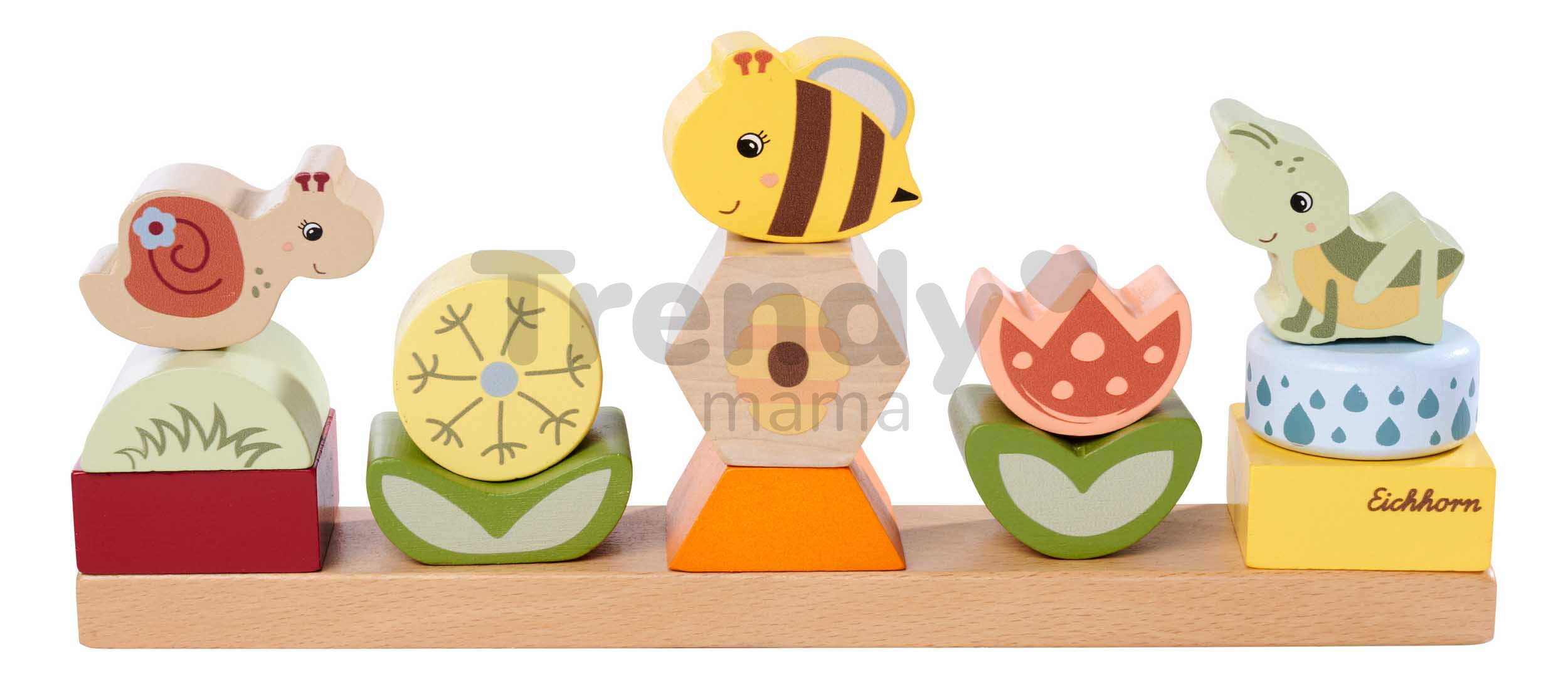 Špičkové dřevěné hračky pro kluky a holky od 2 let přináší značka Eichhorn. Dřevěná skládačka s motivem Květiny a zvířátka obsahuje 13 stohovatelných kostek s podstavcem.