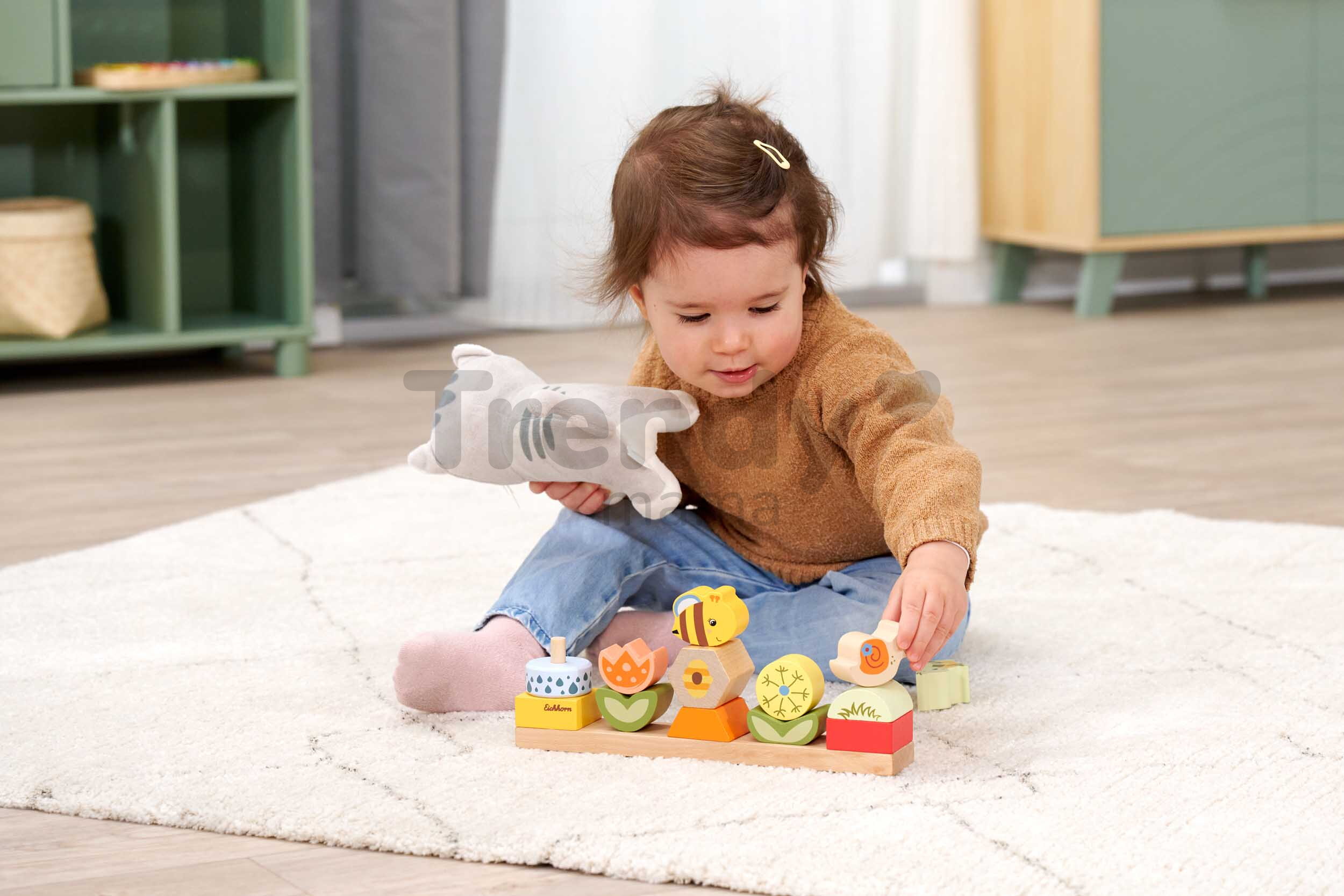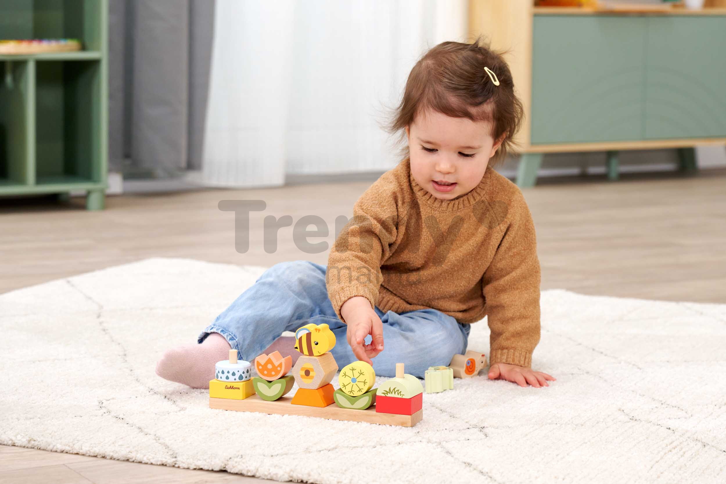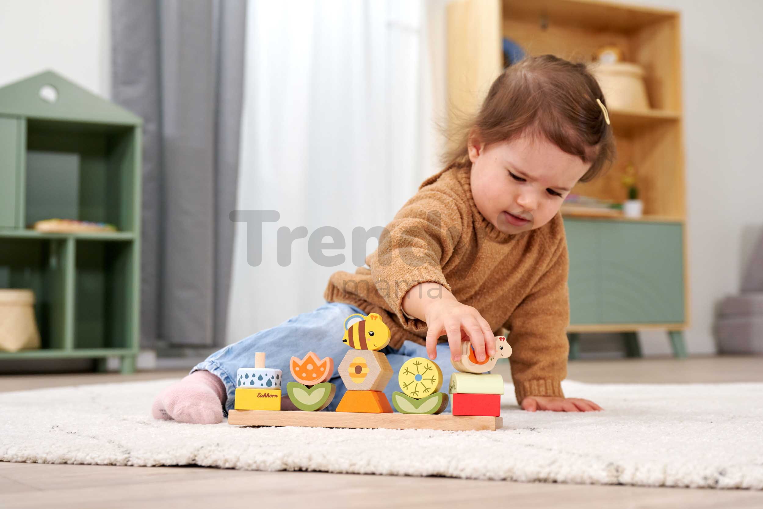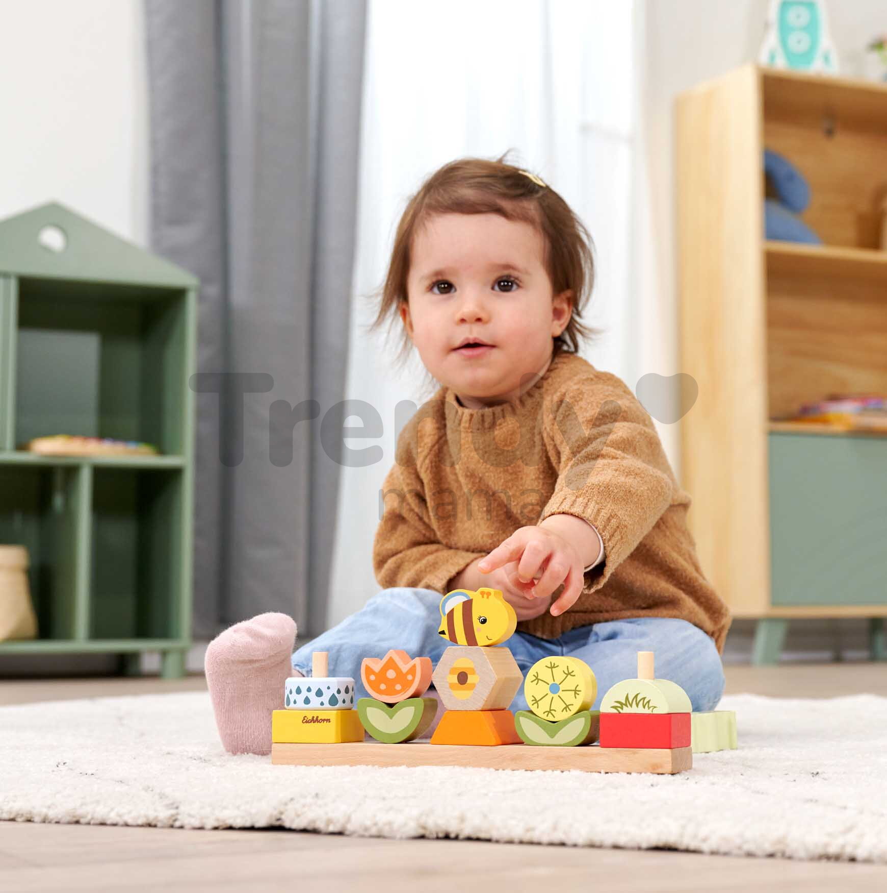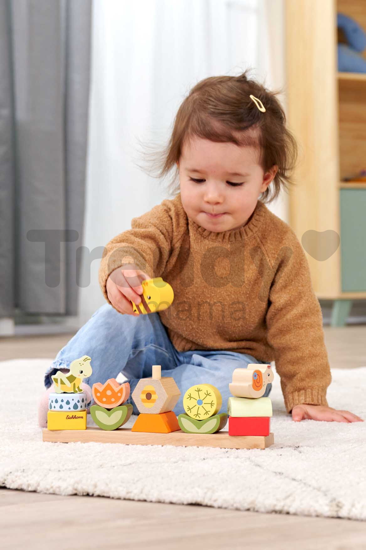 Špičkové dřevěné hračky pro kluky a holky od 2 let přináší značka Eichhorn. Dřevěná skládačka s motivem Květiny a zvířátka obsahuje 13 stohovatelných kostek s podstavcem.