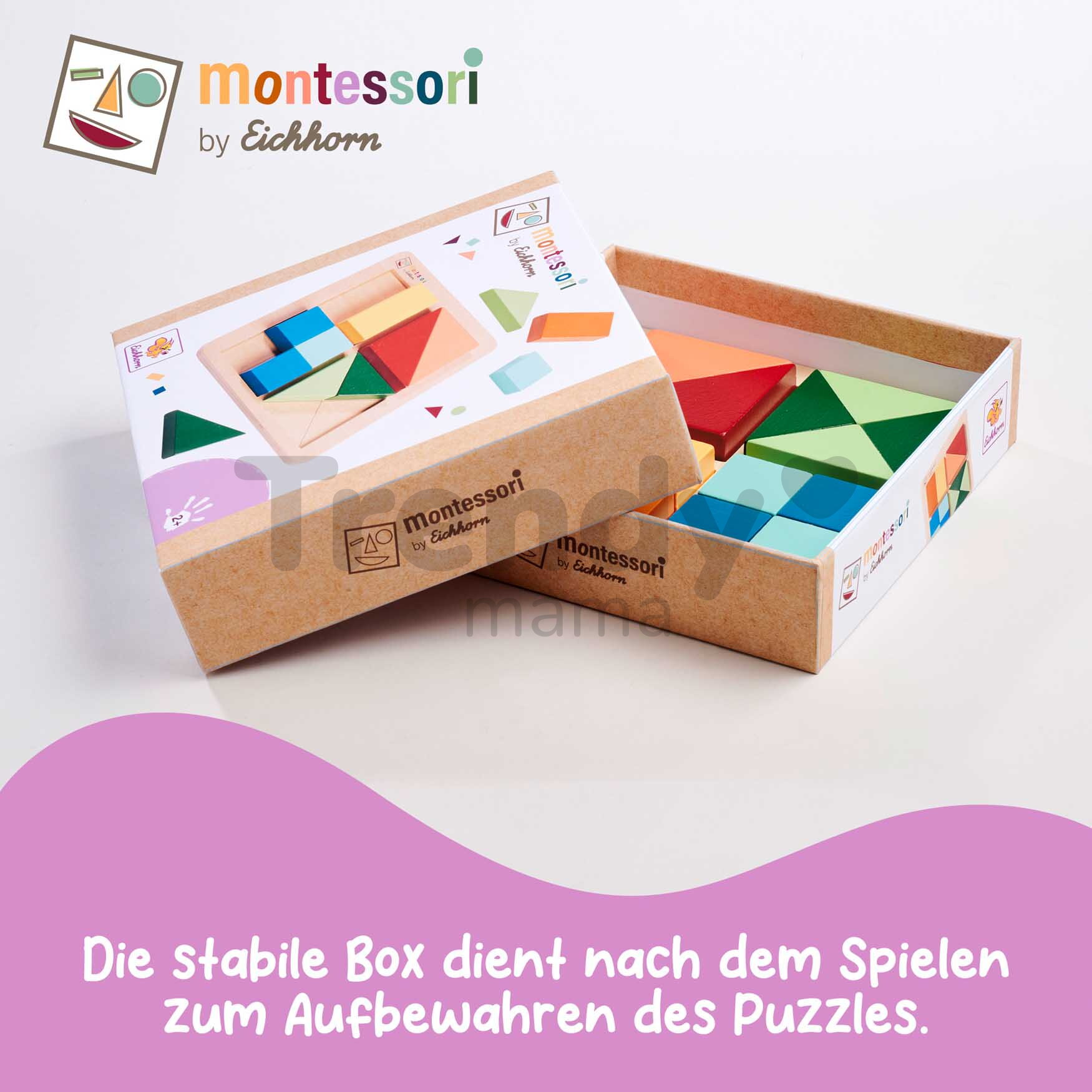 Dřevěné vkládací puzzle Barvy a tvary Montessori Shape Puzzle od německé značky Eichhorn okouzlí chlapce a dívky již od 2 let. Didaktické puzzle obsahují 12 barevných kostek různých tvarů, které se děti učí vkládat do dřevěné základny podle vyznačených linek. Kreativní hračka z kolekce Montessori je zaměřena na rozvoj jemné motoriky dítěte, trpělivosti a poznávání geometrických tvarů. Dřevěné kostky jsou uzpůsobeny pro malé dětské ruce, umožňují snadnou manipulaci. Hravým způsobem samostatně vybírají správné tvary při řešení puzzle, procvičí si logické myšlení a prostorové vidění.