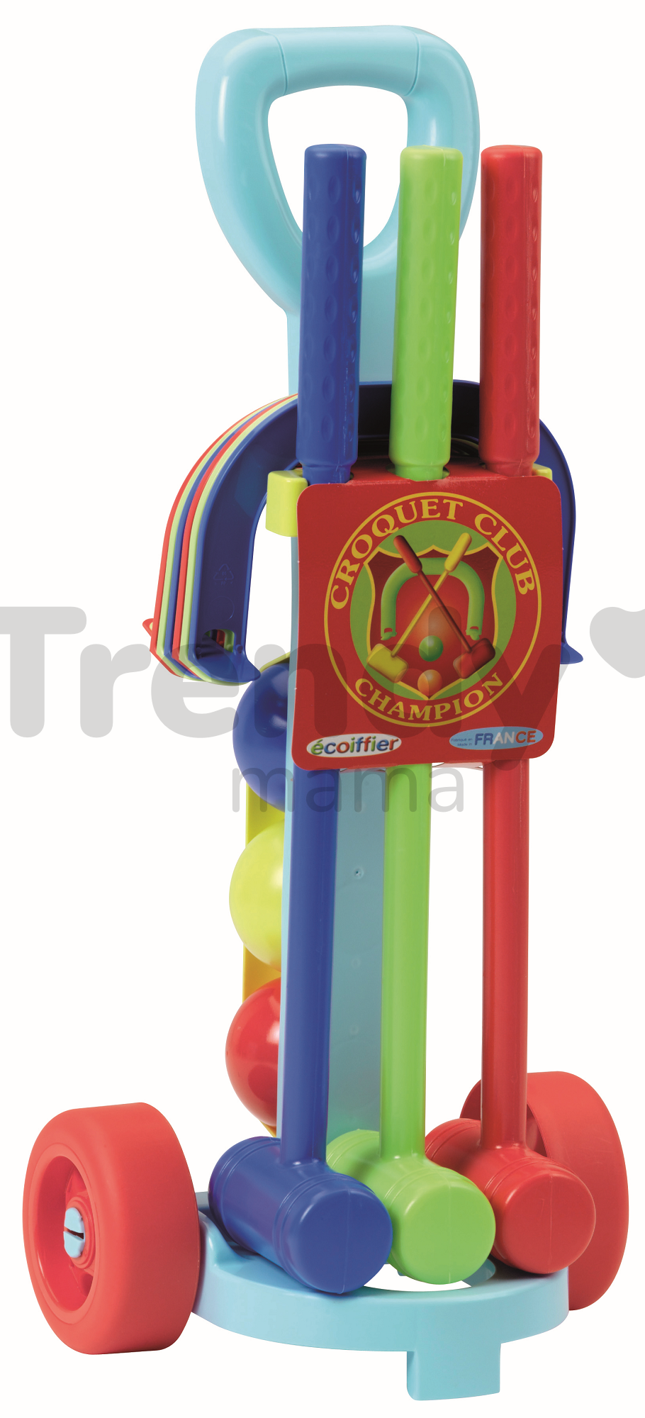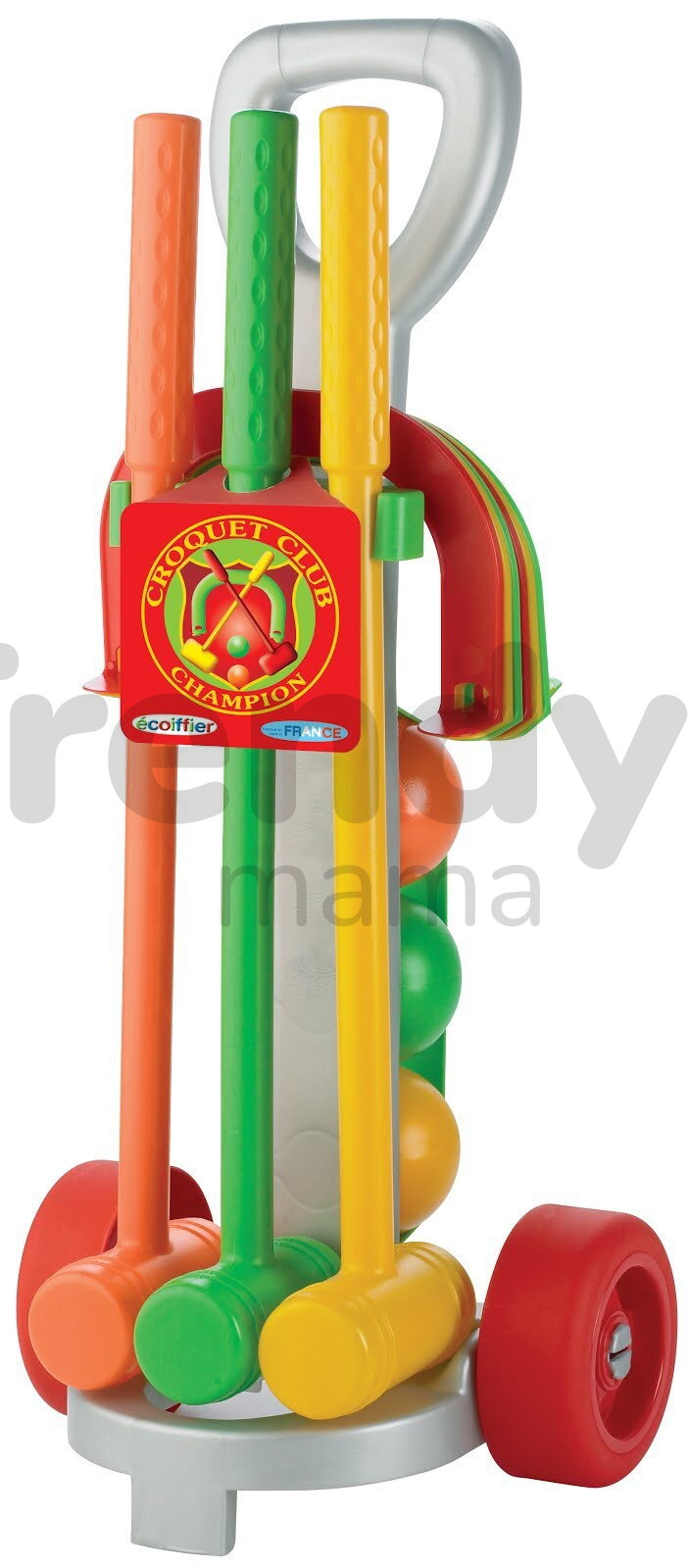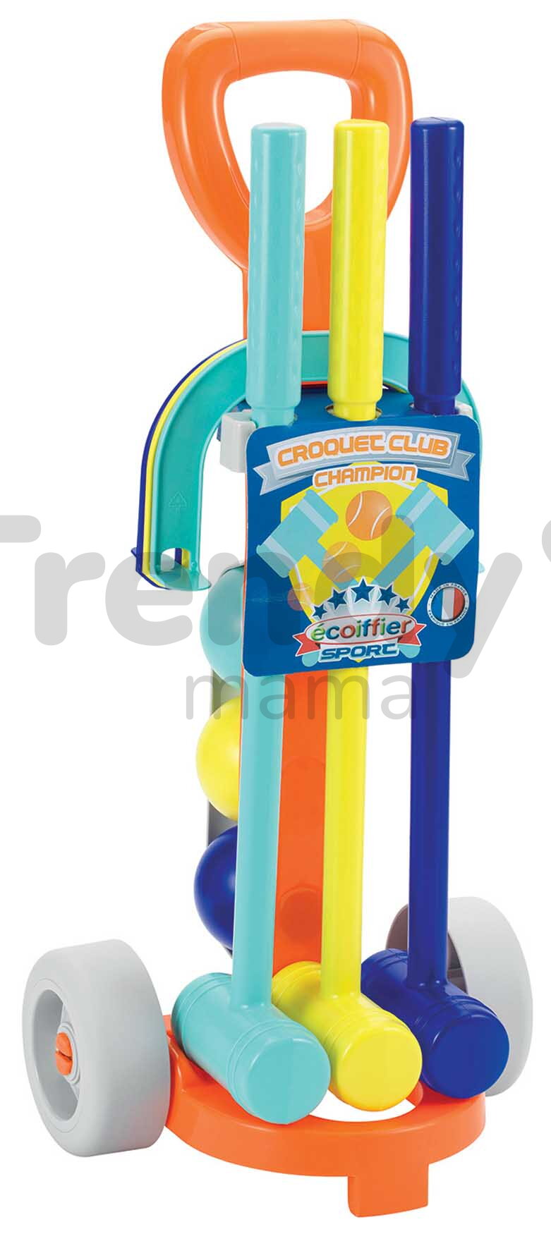 Écoiffier Croquet set s vozíkem od francouzského výrobce pro dívky a chlapce od 18 měsíců je krásná hračka pro hru kroketu. Kroket je zábavná nenáročná hra. Dětský kroket Écoiffier je hra pro děti vhodná do interiéru i exteriéru. Pravidla hry jsou jednoduchá: před začátkem hry se rozestaví plastové branky, které tak utvoří dráhu, a přes tyto branky se hráči pak snaží trefit míč plastovými kladívky. Cílem kroketu je projít celou dráhu na co nejméně úderů. Balení obsahuje šedý plastový vozík, 6 branek, tři lehké plastové kladívka a tři barevné míčky.