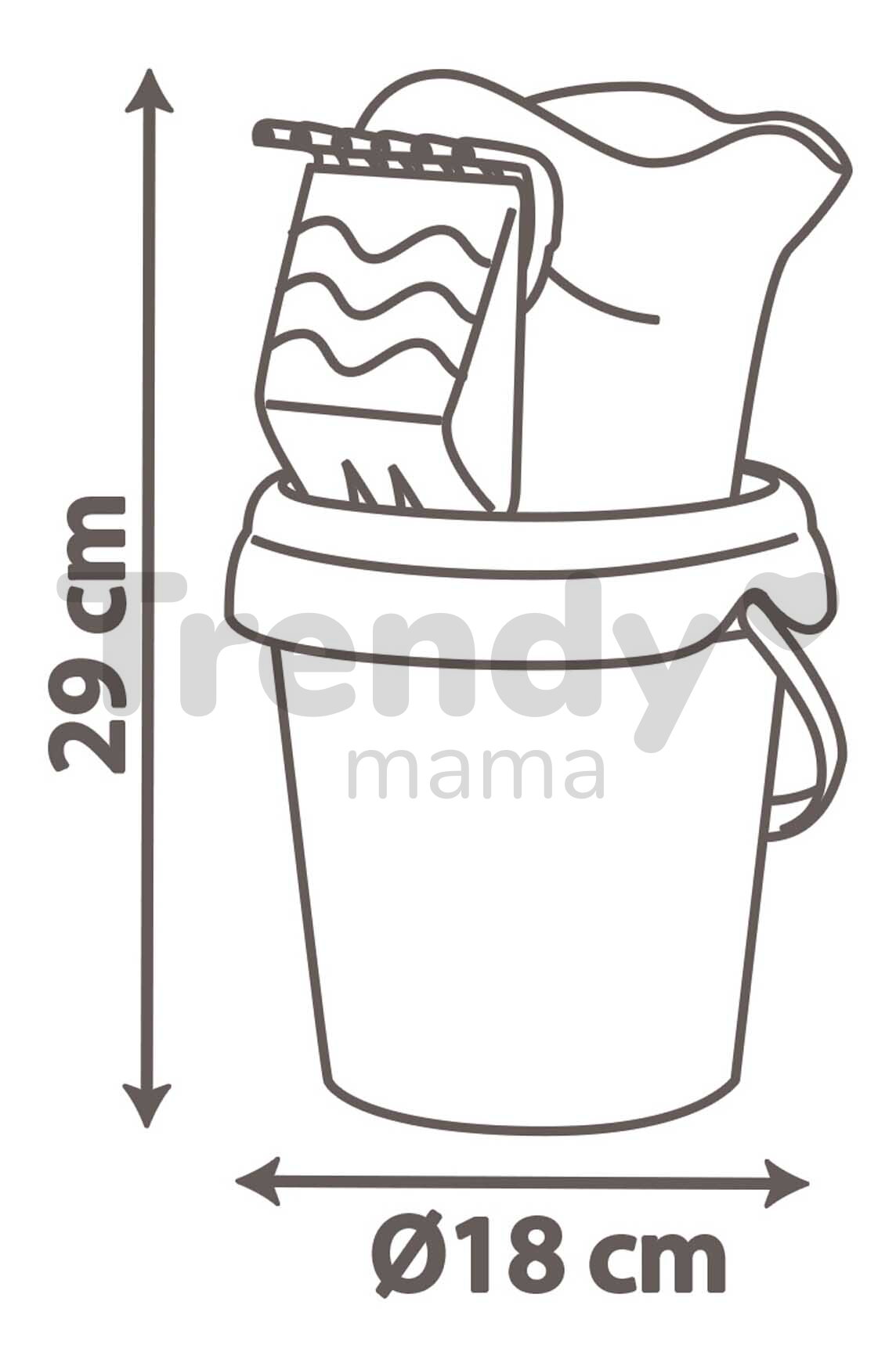 Výška kbelíčku je 18 cm a celá sada má rozměry 18*18*29 cm. Děti kromě kbelíku zabaví celý set hraček, které se designově i funkčně doplňují. Kbelík set byl vyroben ekologickým způsobem, protože až 60 % použitého materiálu tvoří recyklovaný plast. Set na hraní v písku je vyroben z pevného a odolného plastu, který přežije mnohé dětské hry. Renomovaný francouzský výrobce Smoby přináší dětem kvalitní hračky už celé desetiletí. Hračky Smoby mají pestré barvy a proto podněcují dětskou fantazii a představivost, pomáhají jim rozvíjet jemnou motoriku a sebevědomí. Mají také oblé hrany, které chrání děti před zraněním. Plast na hračkách Smoby je sametový na dotek, jsou zárukou francouzské kvality, bezpečnosti a originality.