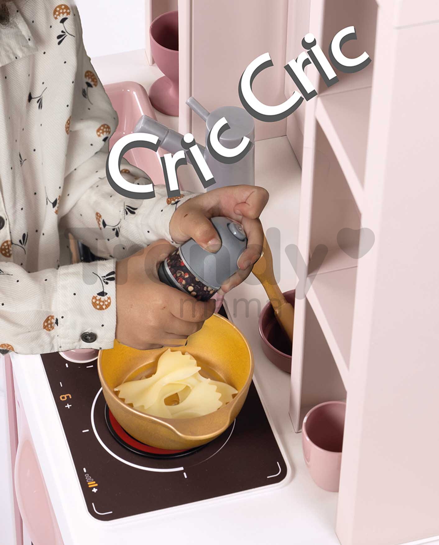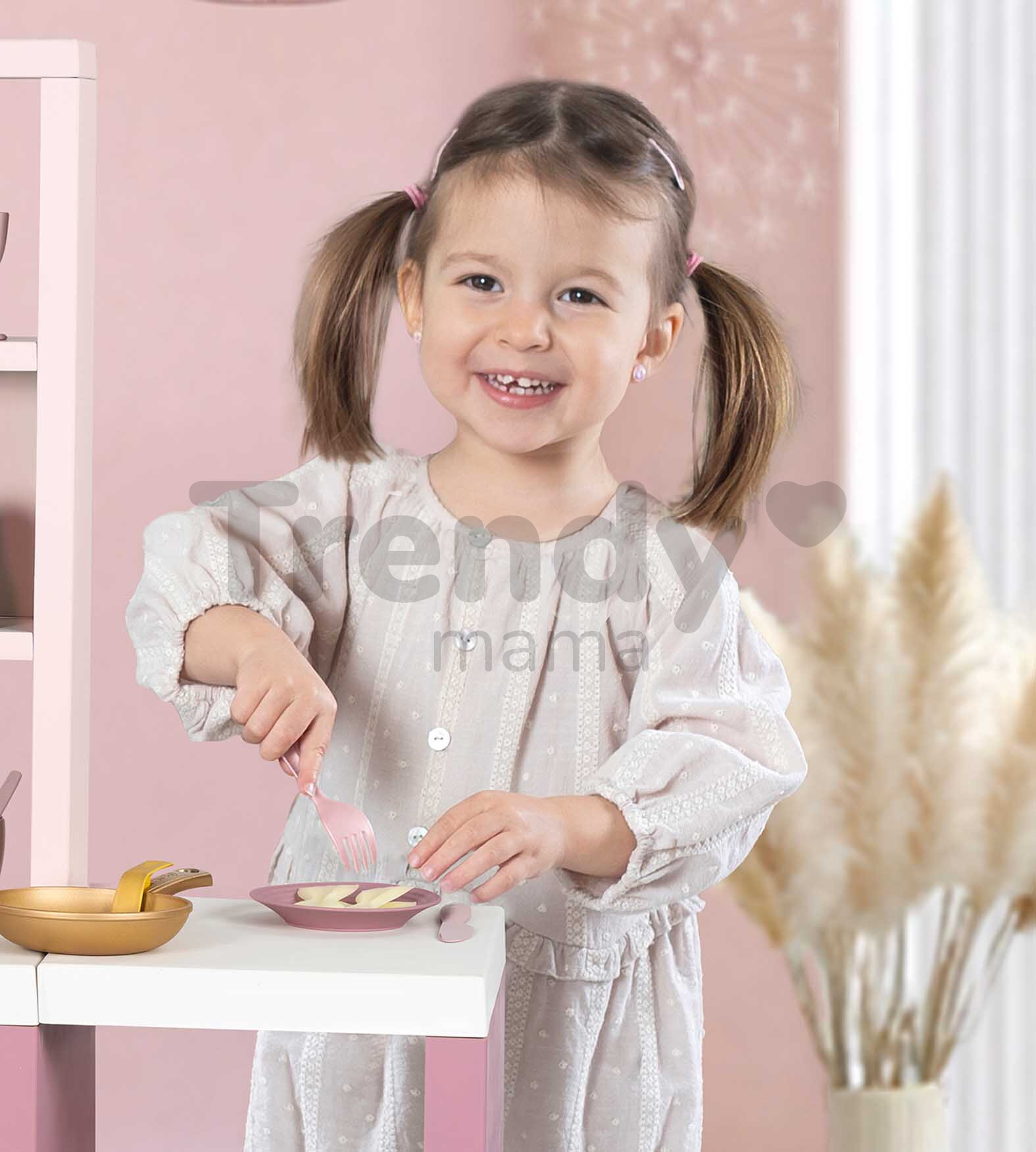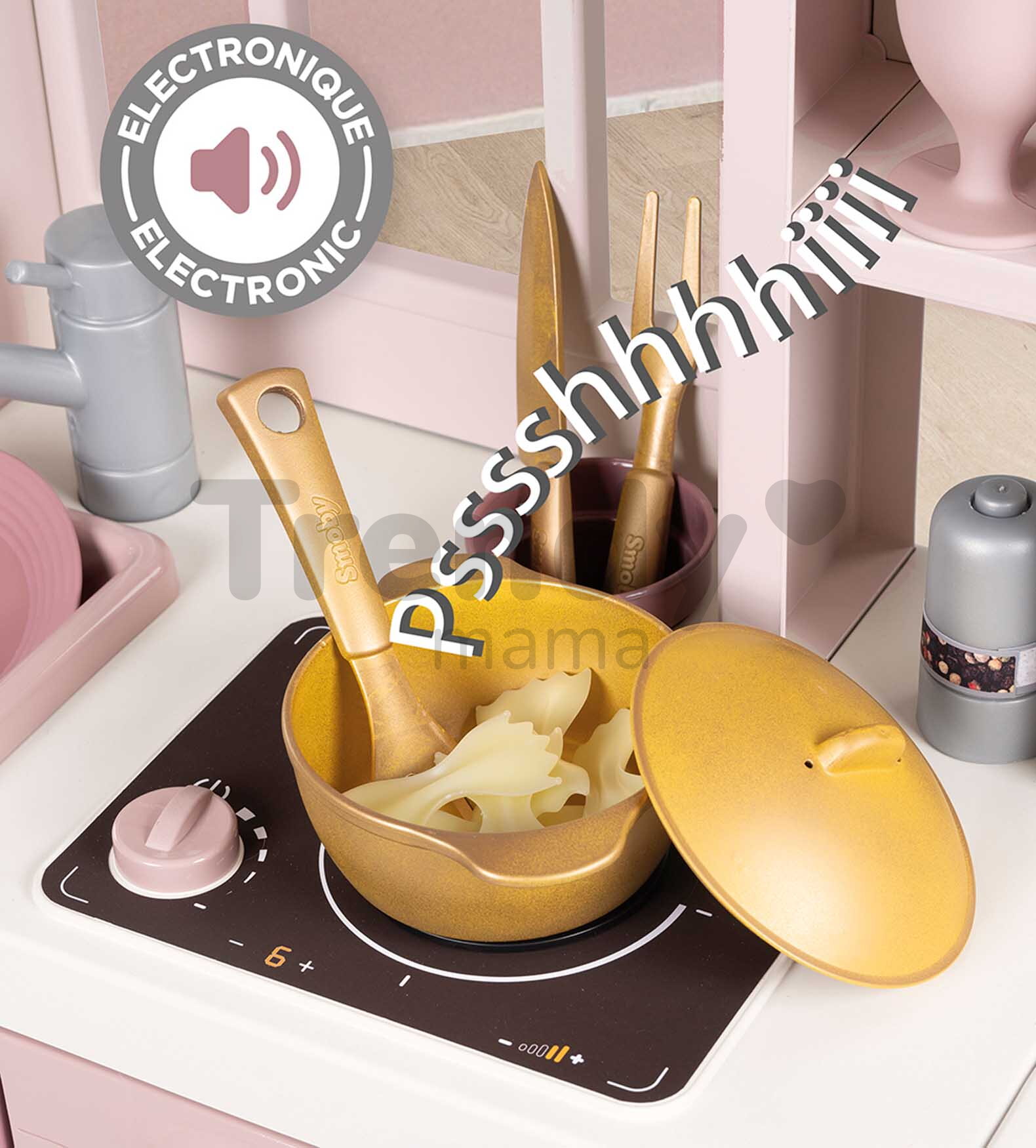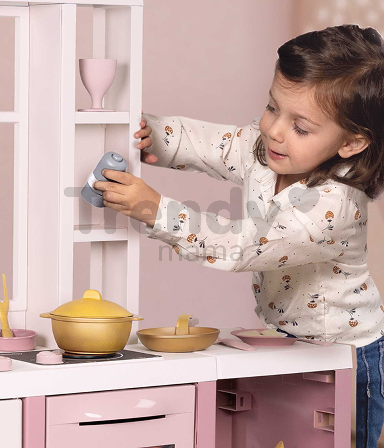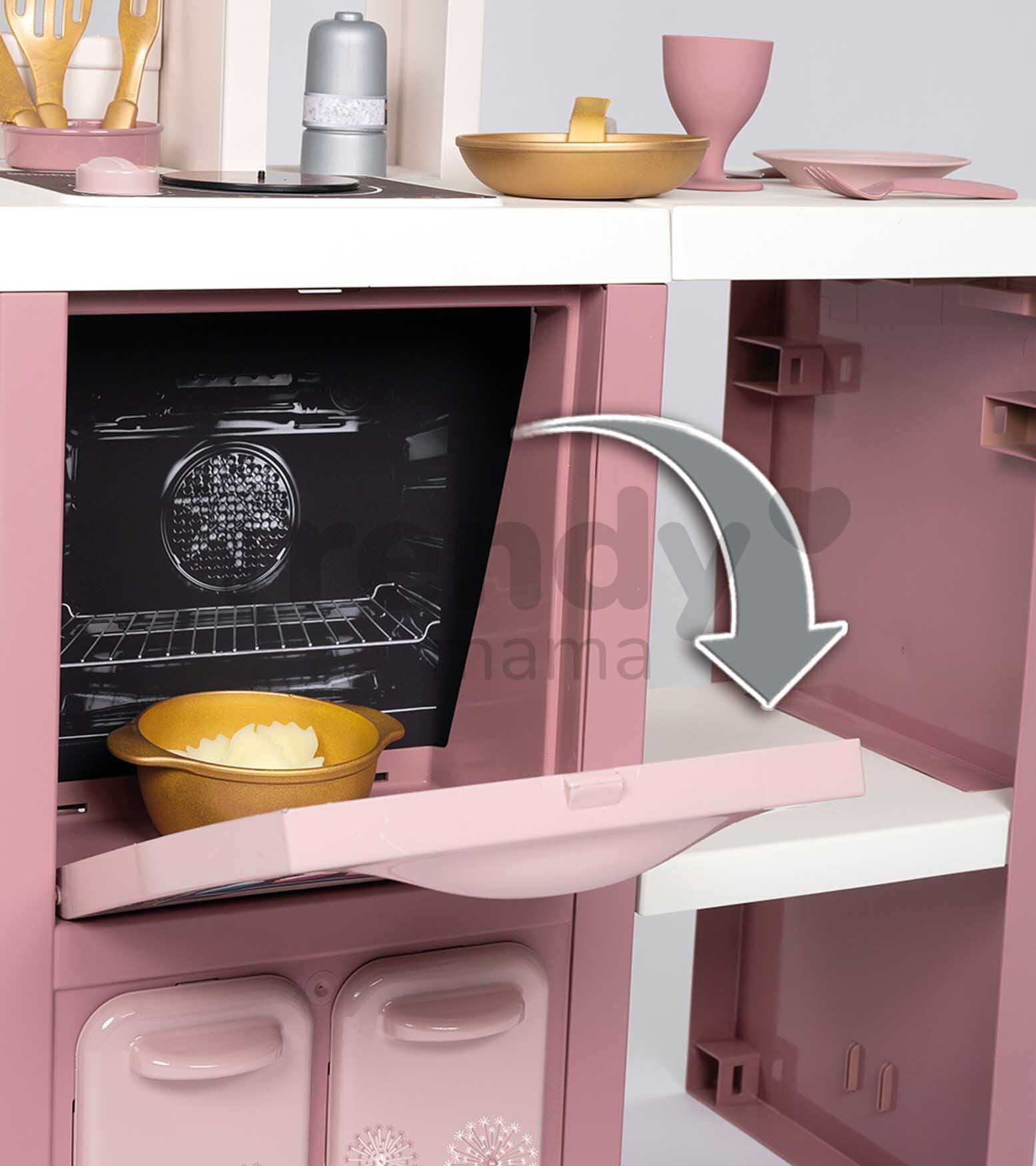 Elektronická kuchyňka Loft Fleur Pink 360° od francouzského výrobce Smoby připraví všem dětem a zejména holčičkám od 3 let skvělé zážitky při hře na šéfkuchařky. Kuchyňka s motivem pampelišek a elegantním zlatým a růžovým nádobím je plně přizpůsobena potřebám malých kuchařek. Děti se při vaření zabaví na dlouhé hodiny, získají realistické zážitky při přípravě magických těstovin, které v závislosti na okolním prostředí dokážou měnit barvu a naučí se připravovat palačinku na pánvi s funkcí otáčení jako skuteční šéfkuchaři. Součástí kuchyňky je až 27 doplňků, mezi kterými jsou nožíky, vidličky, lžičky, talířky, solnička, kuchyňské náčiní, magické těstoviny, palačinka, hrnec s poklicí, pánev a kelímky na odkládání příboru.