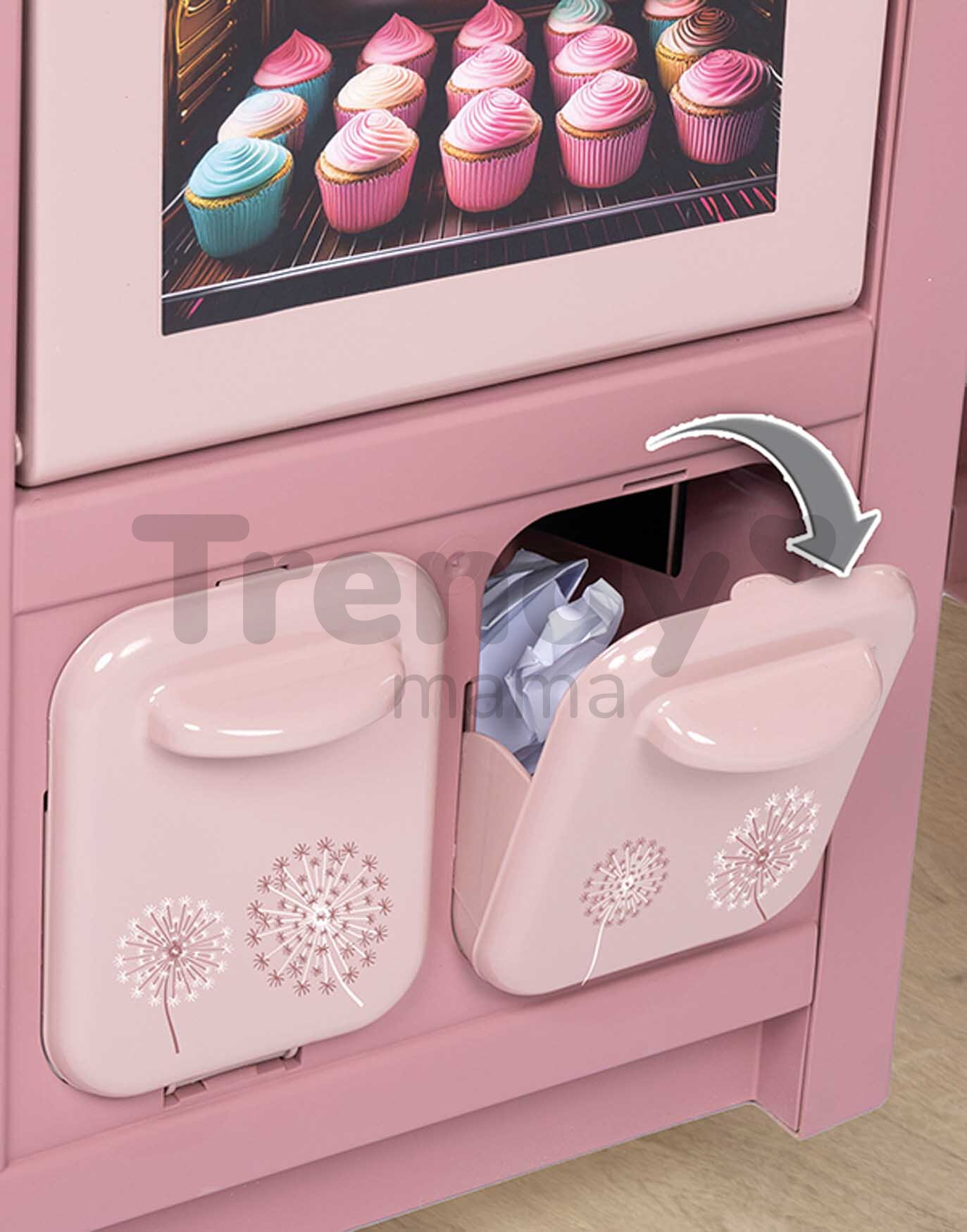 Oboustranná kuchyňka nabídne dětem přístup z více stran, díky čemuž ji dokáže využívat i více najednou. Ve spodní části kuchyňky se nachází chladnička, otevíratelná trouba na pečení, přihrádky na třídění odpadu a police na odkládání kuchyňských potřeb. Malé hospodyňky potěší i dřez s kohoutkem a varná deska s elektronickým modulem je zaujme realistickým zvukem při vaření. Nadčasová kuchyňka je vybavena množstvím úložného prostoru a designovými poličkami, na které mohou pokládat kuchyňské náčiní a doplňky.