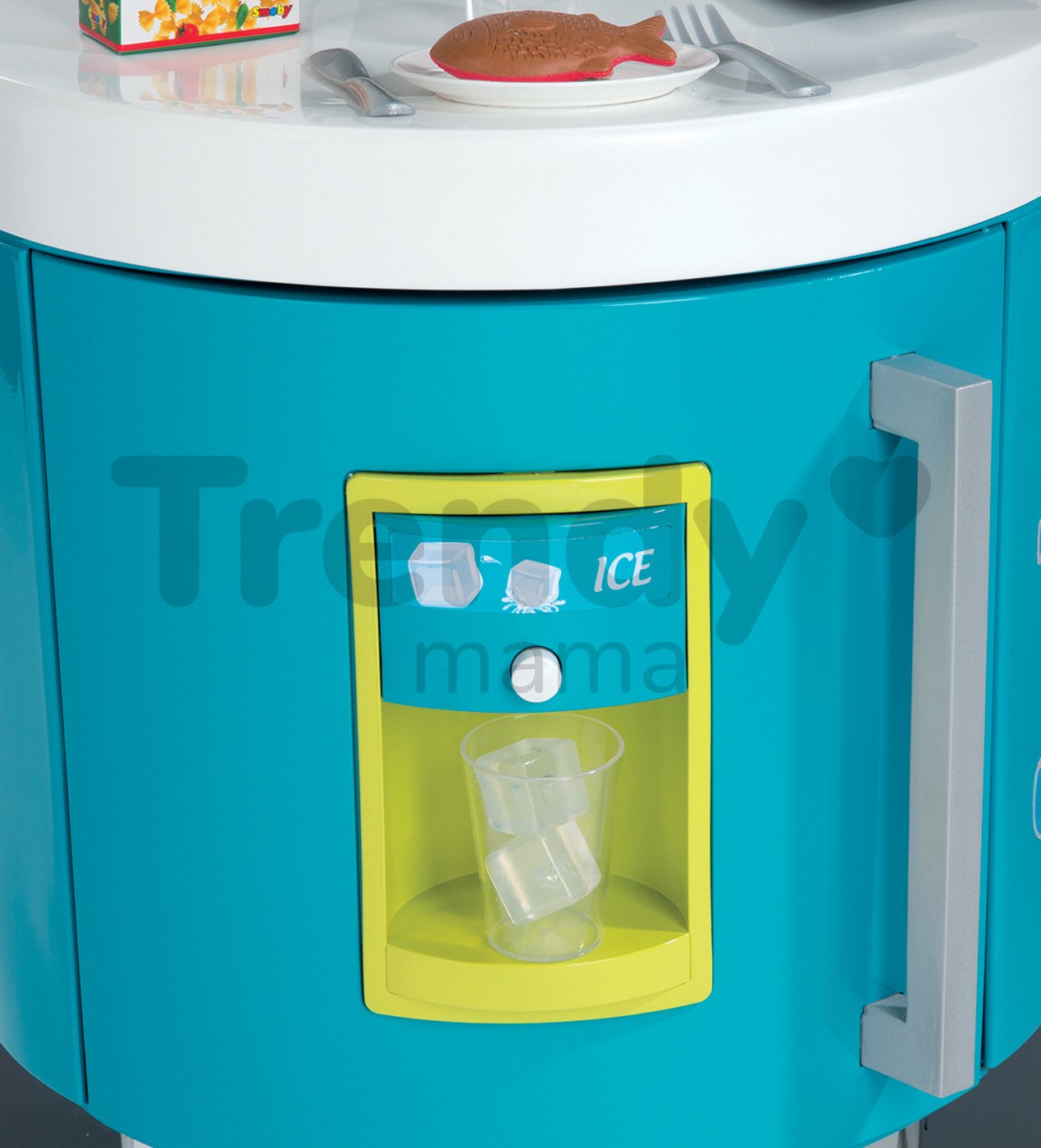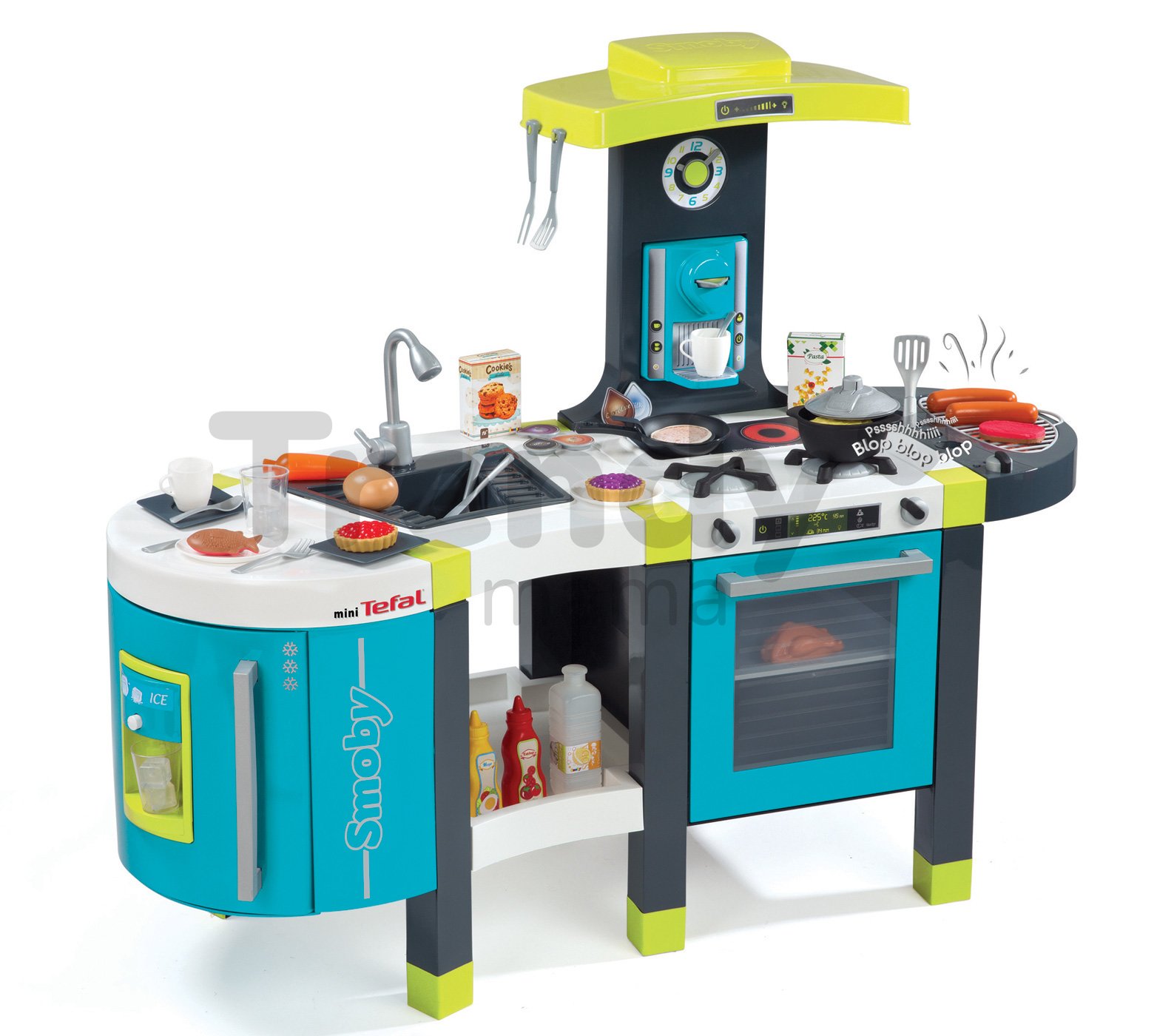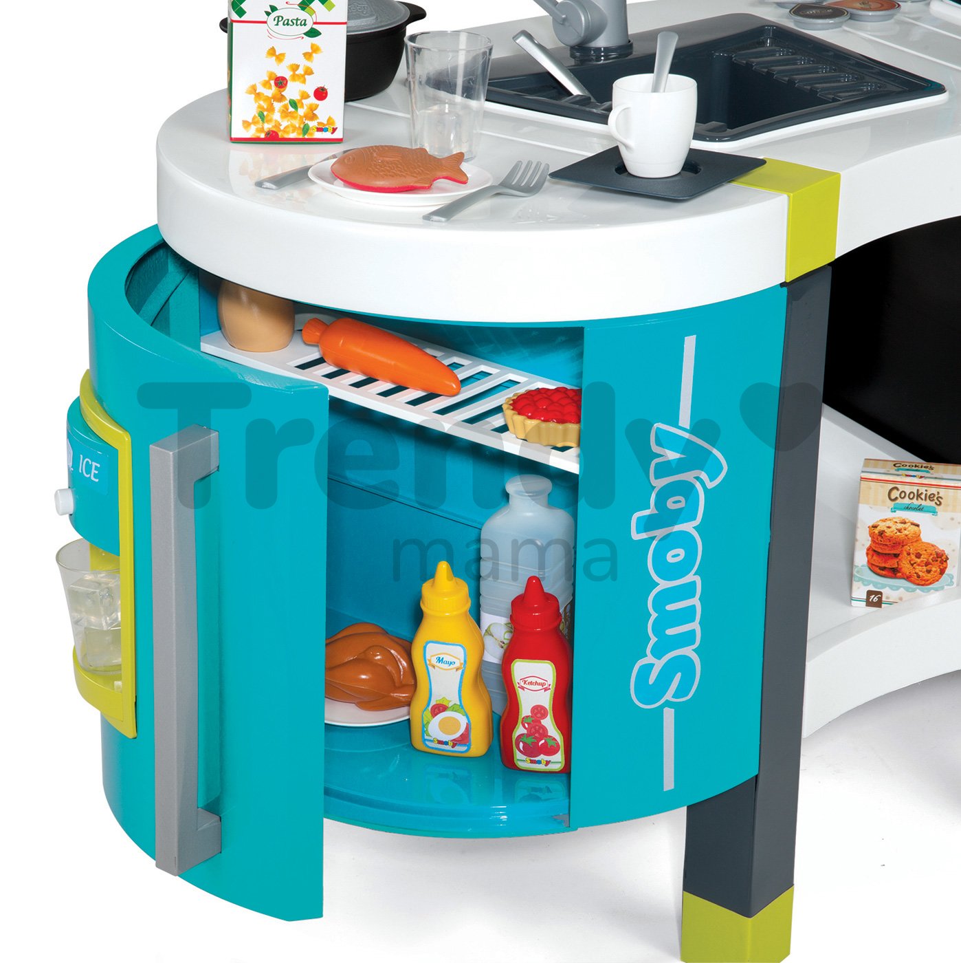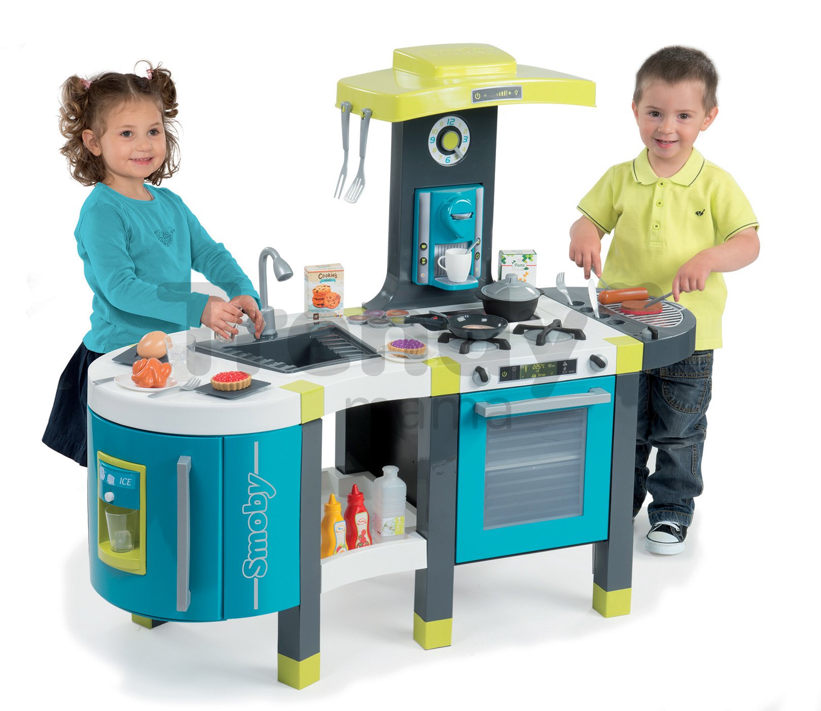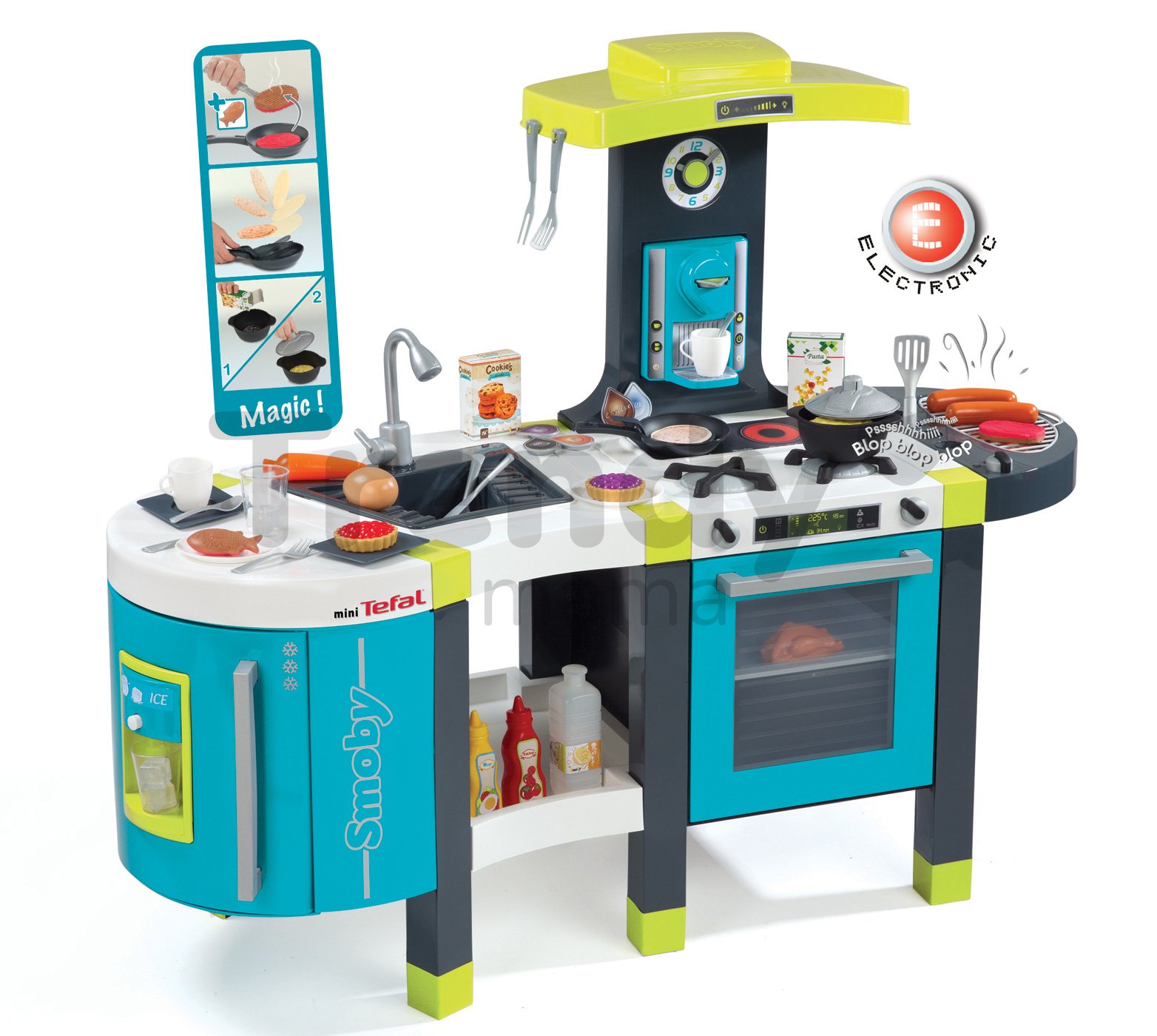 Dětská elektronická kuchyňka Smoby Tefal French Touch je krásná a inovativní dětská kuchyňka se zvukovými funkcemi, magickými potravinami a množstvím doplňků, které ji činí jedinečnou. Kuchyňka pro děti Tefal French Touch má krásné barevné provedení zářivé modré barvy v kombinaci s bílou pracovní deskou a šedými a svěže zelenými doplňky. Kuchyňka pro děti je inspirována novými módními trendy a její provedení dokonale kopíruje realistické designérské kuchyně. Její zářivé barvy navíc vzbuzují u dětí fantazii a představivost. Kuchyňka Smoby je vhodná pro chlapce a dívky ve věku od 3 let. Všechny detaily kuchyňky jsou přizpůsobeny malým dětským ručkám. Děti si tak pěstují hmatovou citlivost a koordinaci pohybů. Hra s dětskou kuchyňkou u dětí pomáhá rozvíjet komunikační schopnosti, a hrou napodobují dospělé. Dětská kuchyňka je elektronická, a má speciální funkce, které hru dělají realistickou a jedinečnou.