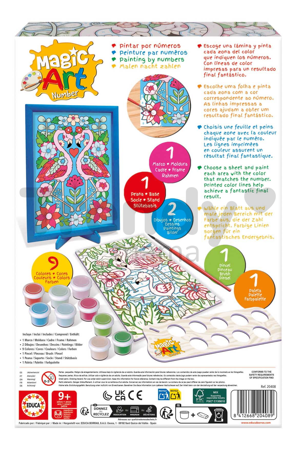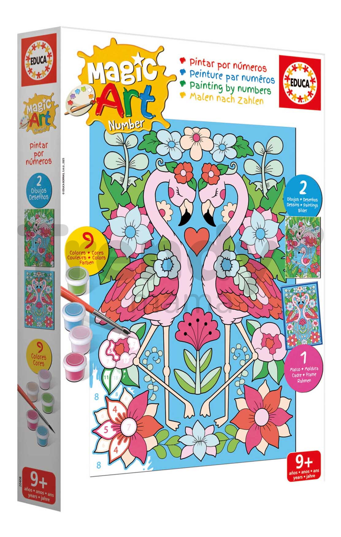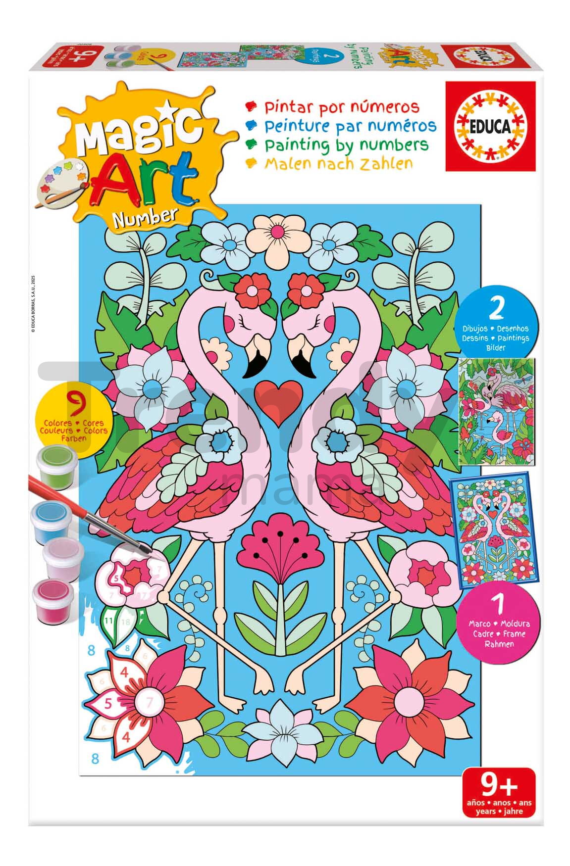 Malování podle čísel Flamingos Magic Art Number od španělského výrobce Educa představuje skvělý dárek pro chlapce a dívky již od 9 let. Děti potěší 2 obrázky s motivem plameňáka, které se naučí vymalovat podle čísel – obrázky jsou předkreslené a označené čísly a liniemi, které odpovídají určité barvě. Kreativní sada na malování obsahuje 9 barev v dózách s paletou, štětec, stojan a rámeček, do kterého si děti vloží vymalovaný obrázek. Kreativní sada pro malování podle čísel pomůže dětem poznávat čísla a jednotlivé barvy, malováním si trénují pozornost, koordinaci a soustředí se na detaily.