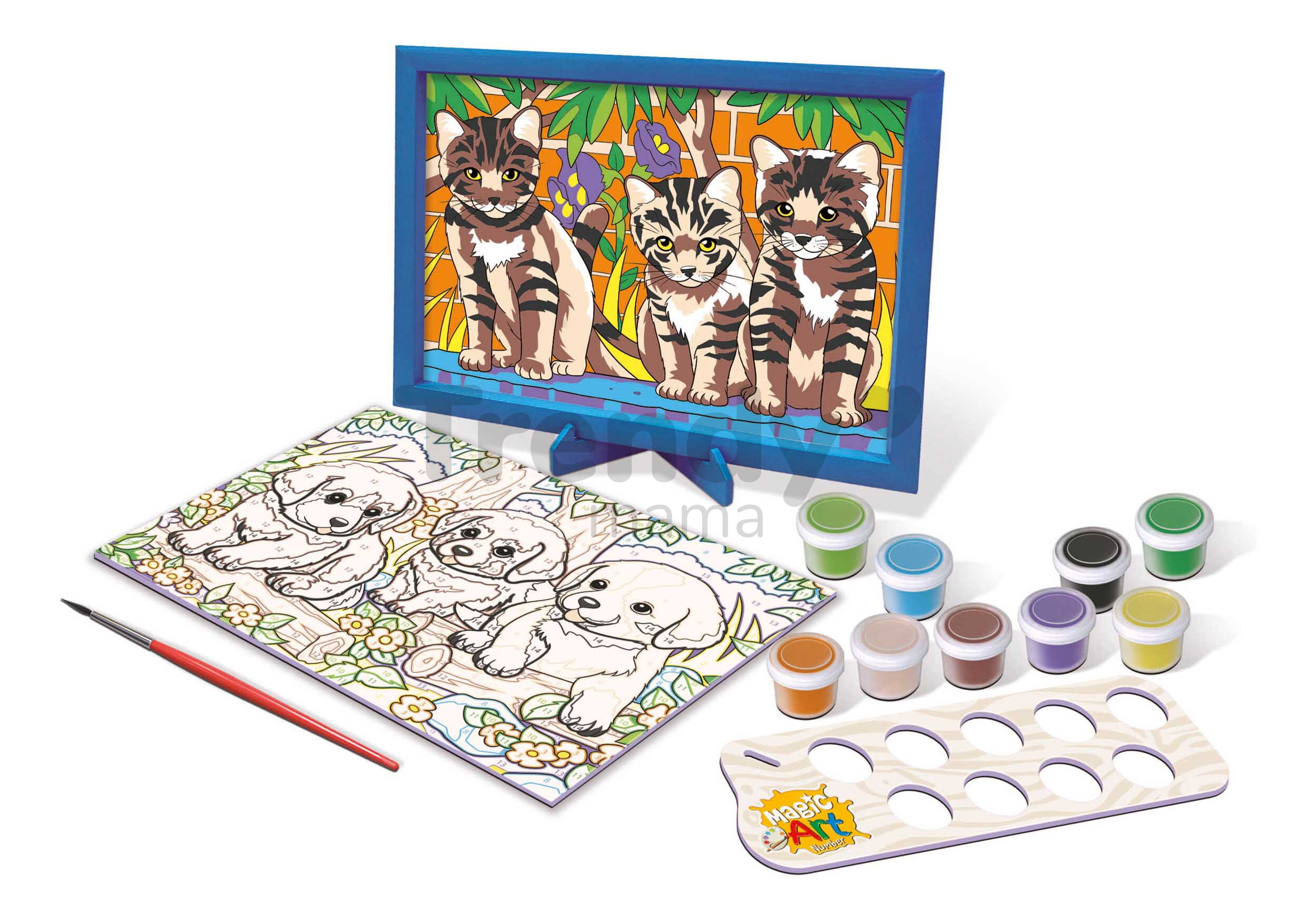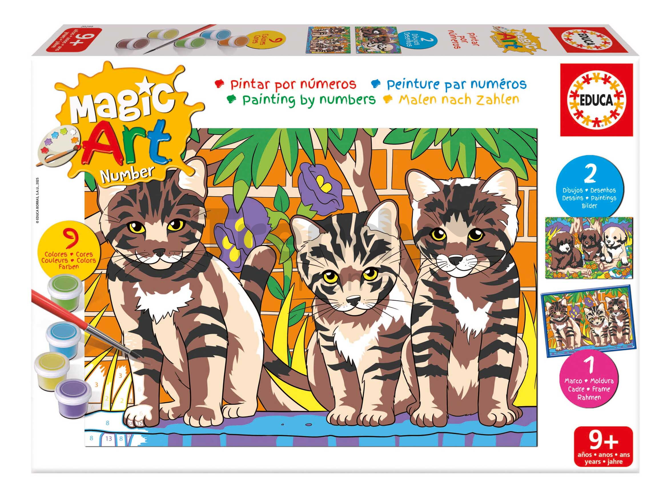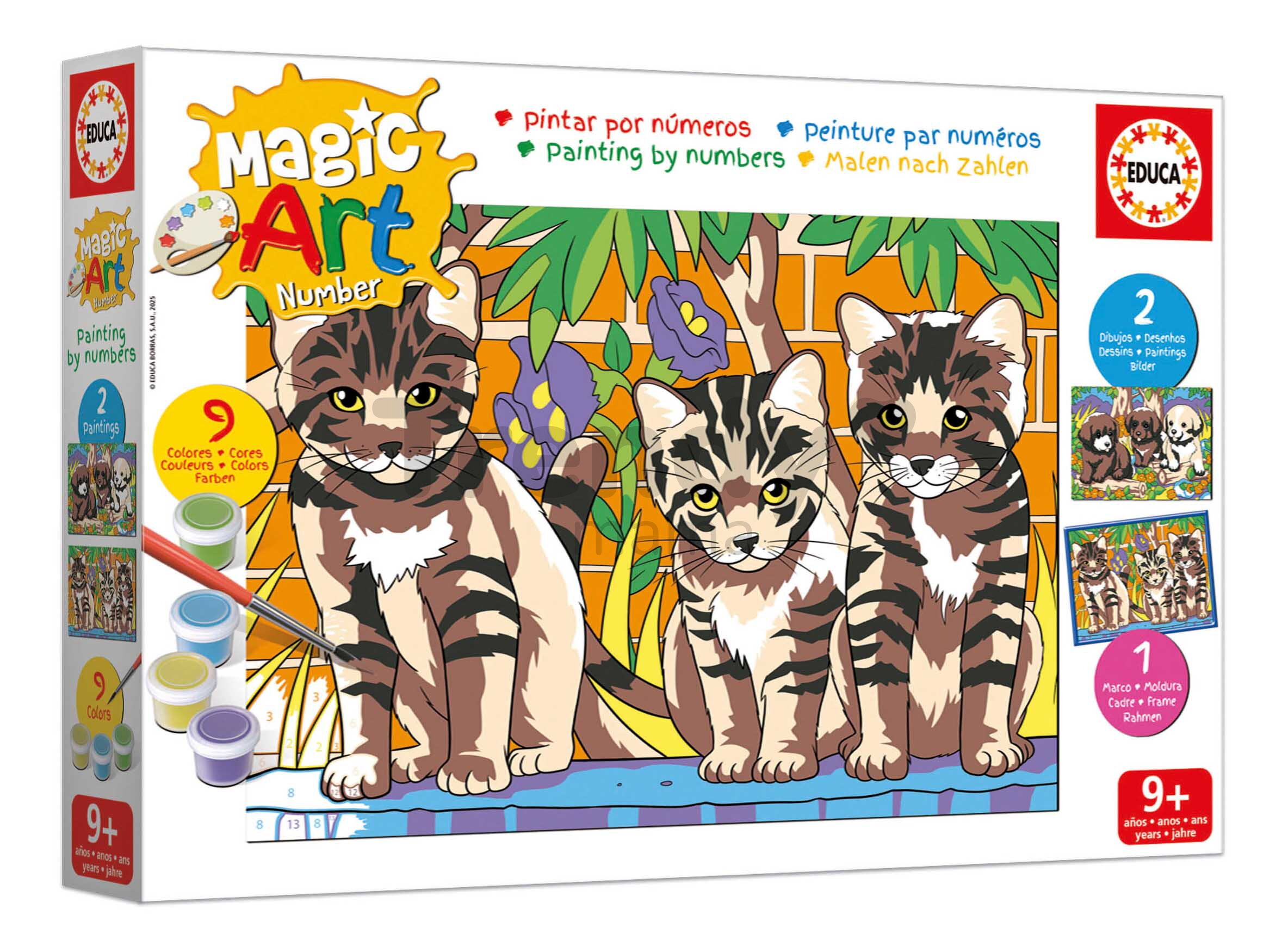 Malování podle čísel Cats & Dogs Magic Art Number od španělského výrobce Educa představuje originální dárek pro chlapce a dívky již od 9 let. Děti potěší 2 obrázky s motivem štěňátek a kočiček, které se naučí vymalovat podle čísel – obrázky jsou předkreslené a označené čísly a liniemi, které odpovídají určité barvě. Kreativní sada na malování obsahuje 9 barev v dózách s paletou, štětec, stojan a rámeček, do kterého si děti vloží vymalovaný obrázek. Kreativní sada pro malování podle čísel pomůže dětem poznávat čísla a jednotlivé barvy, malováním si trénují pozornost, koordinaci a soustředí se na detaily.