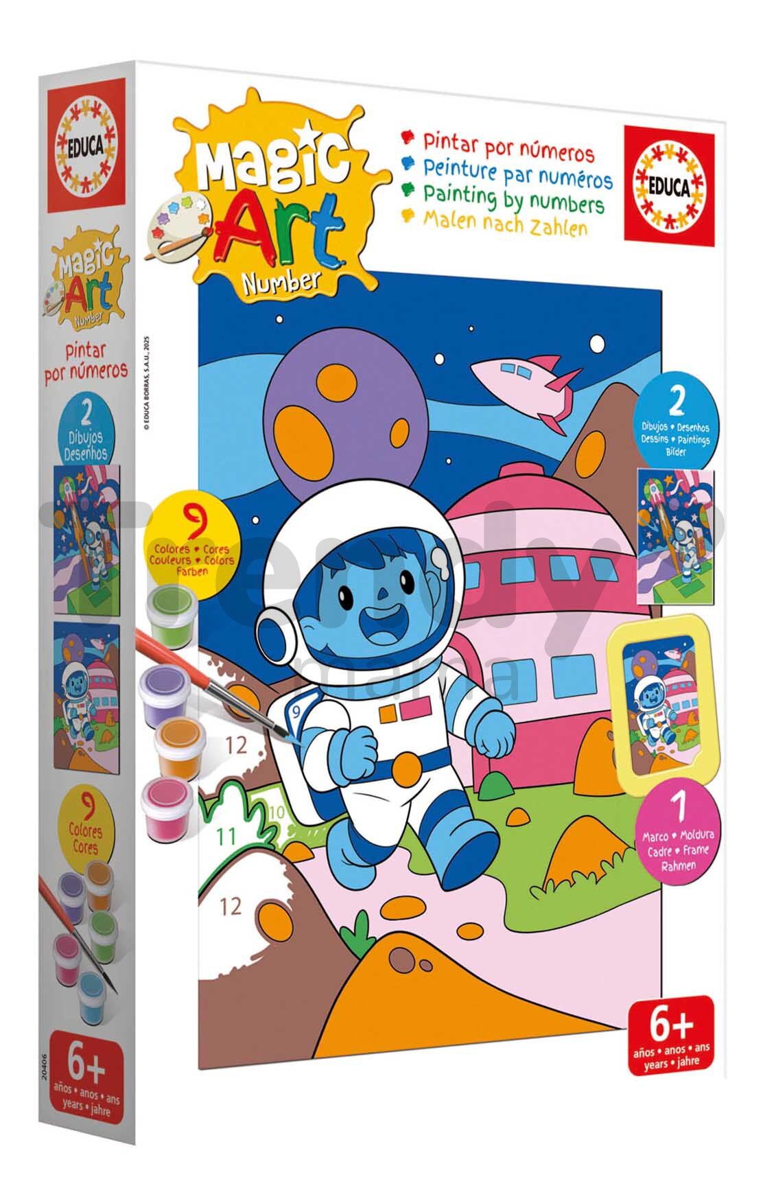 Malování podle čísel Number Space Scene Magic Art Number od španělského výrobce Educa představuje originální dárek pro chlapce a dívky již od 6 let. Děti potěší 2 obrázky s motivem vesmíru, které se naučí vymalovat podle čísel – obrázky jsou předkreslené a označené čísly a liniemi, které odpovídají určité barvě. Kreativní sada na malování obsahuje 9 barev v dózách s paletou, štětec a rámeček, do kterého si děti vloží vymalovaný obrázek. Kreativní sada pro malování podle čísel pomůže dětem poznávat čísla a jednotlivé barvy, malováním si trénují pozornost, koordinaci a soustředí se na detaily.