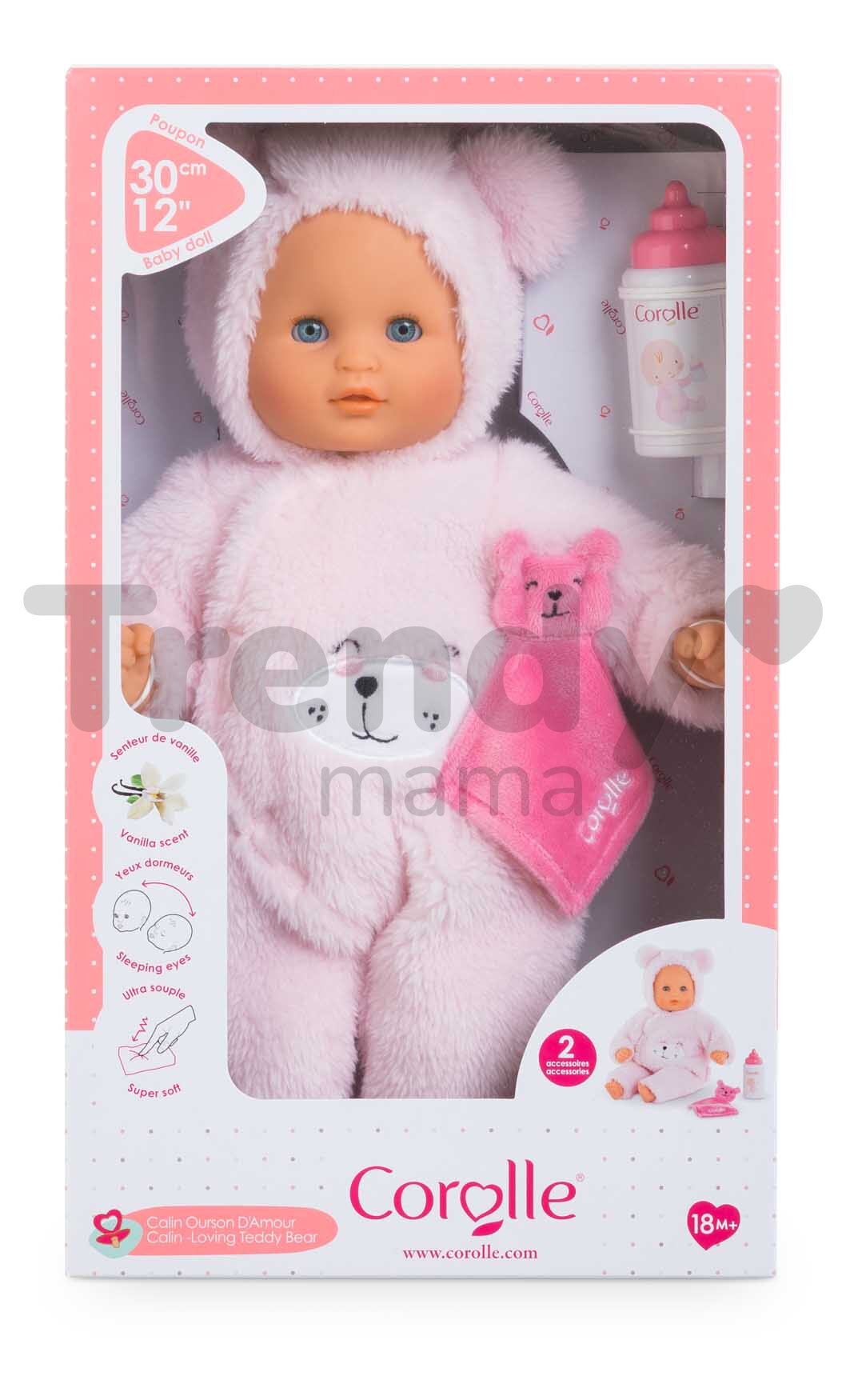 Jedinečná panenka Bébé Calin Loving Teddy Bear je velká 30 cm, takže do náruče vašeho děťátka padne jako ulitá. Hra s ní bude díky její velikosti, ale i dokonale propracovaným detailům, jemné pokožce a měkkému tělíčku k nezaplacení. Jedinečnost panenky Corolle se ukrývá i v jemné vanilkové vůni, která působí uklidňujícím dojmem a ani po mnoha vypráních se neztratí. Nádhernou panenku s modrýma mrkacíma očima mohou vaše děti krmit, koupat, přebalovat, ale díky obrovskému množství doplňků i převlékat.
