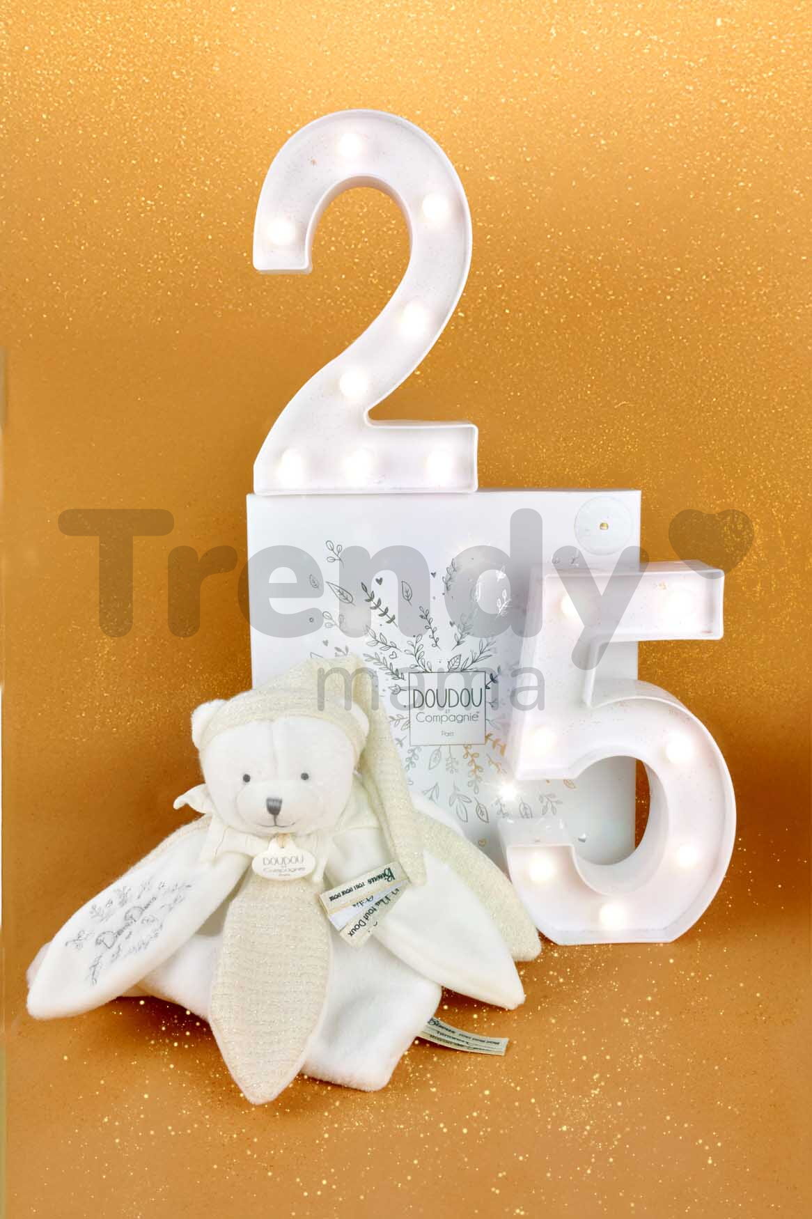 Plyšový medvídek k mazlení vznikl u příležitosti 25. narozenin značky Doudou et Compagnie a má symbolickou velikost 25 cm. Měkký a jemný plyšový medvídek je vyroben z kvalitního, hebkého plyše a světlého tvídu a jeho tělíčko připomíná lupeny květů. Tyto okvětní lístky probouzejí smysly, podporují jemnou motoriku a zároveň miminku posyktují chvíle pohodlí. Za jednotlivé lupeny ho miminko snadno uchopí prštěky, přitulí se k němu a v přítomnosti této plyšové hračky najde komfort a útočiště.