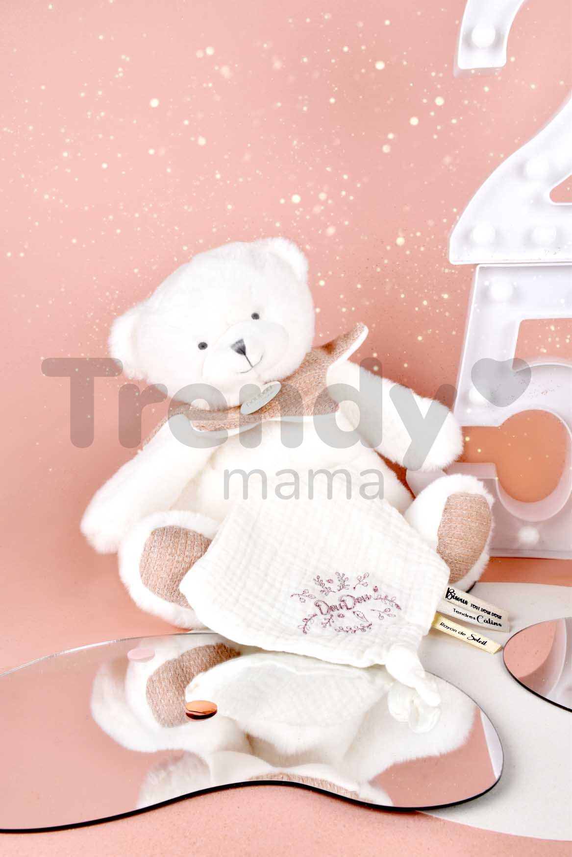 Přivítejte miminko na tomto světě s něhou a podarujte mu plyšového kamaráda na celý život. Plyšový medvídek s hadříkem na mazlení je dokonalou kombinací všech kouzelných ingrediencí pocházejících z designérské dílny Doudou et Compagnie. Měkké bříško, rozkošná tvářička, límeček a hadřík na mazlení představují recept na stimulaci smyslů miminka již od narození. Plyšový medvídek v něžných barvách přivítá vaše miminko na tomto světě s jemností a láskou, jakou si zaslouží každý novorozenec.