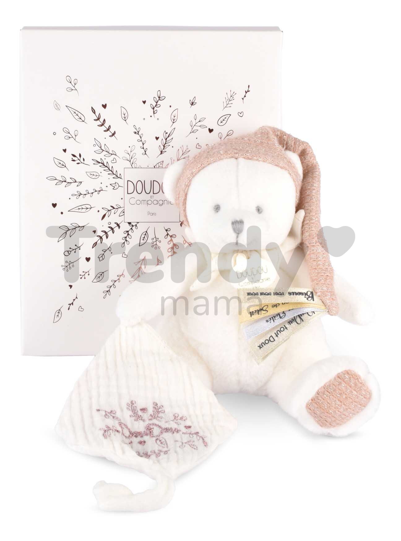 Růžový plyšový medvídek s noční čepičkou a límečkem je vyroben z jemného tvídového materiálu a je připraven k tomu nejhorší zacházení a fleky od jídla. Medvídka můžete prát v pračce při 30 °C na jemném cyklu, což mu opět navrátí jeho eleganci. Plyšový medvídek Doudou et Compagnie splňuje nejpřísnější bezpečnostní kritéria a je testován nezávislými, schválenými laboratořemi. Bez obav jej můžete vložit do dětských dlaní, kam právem patří.