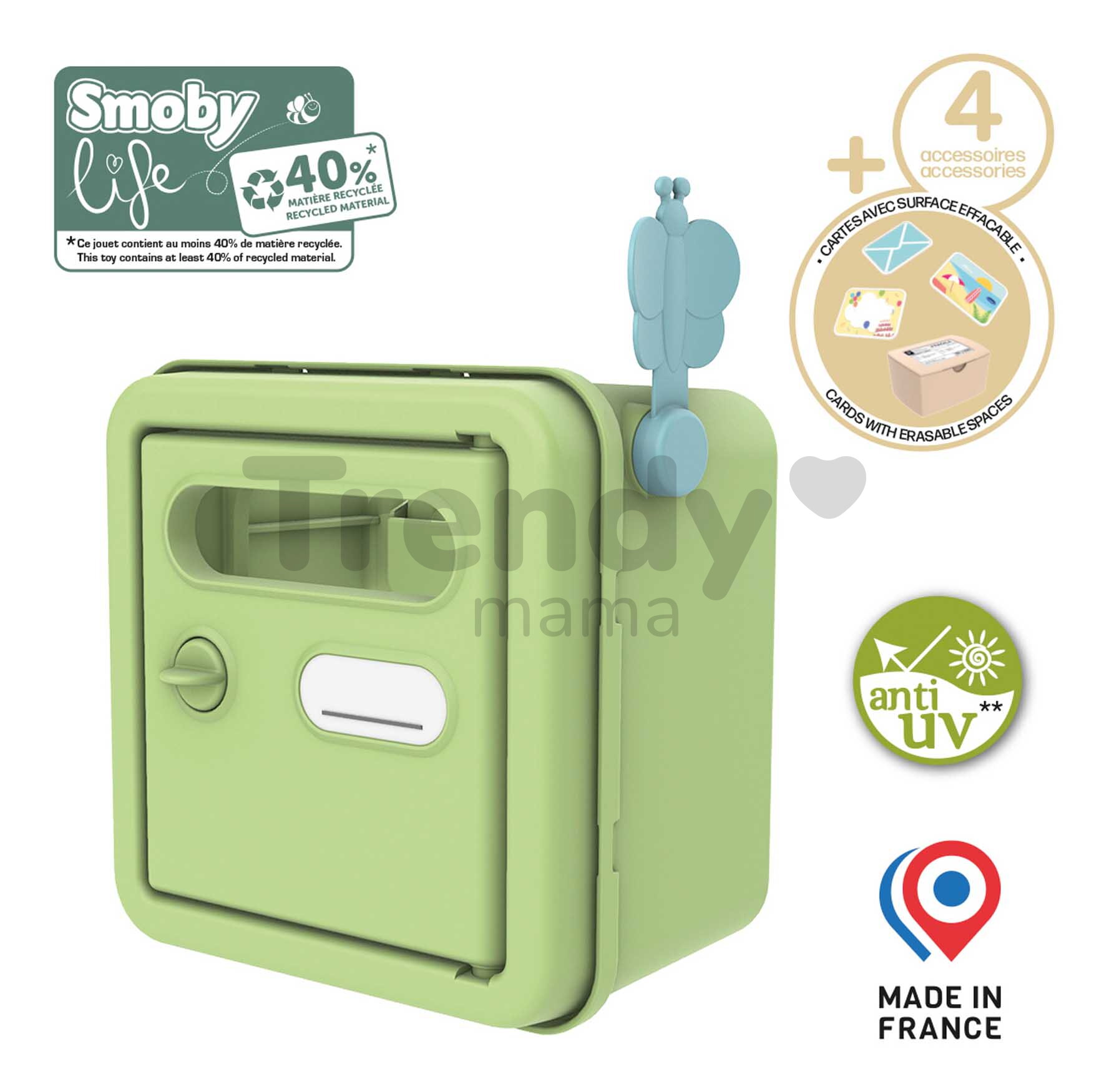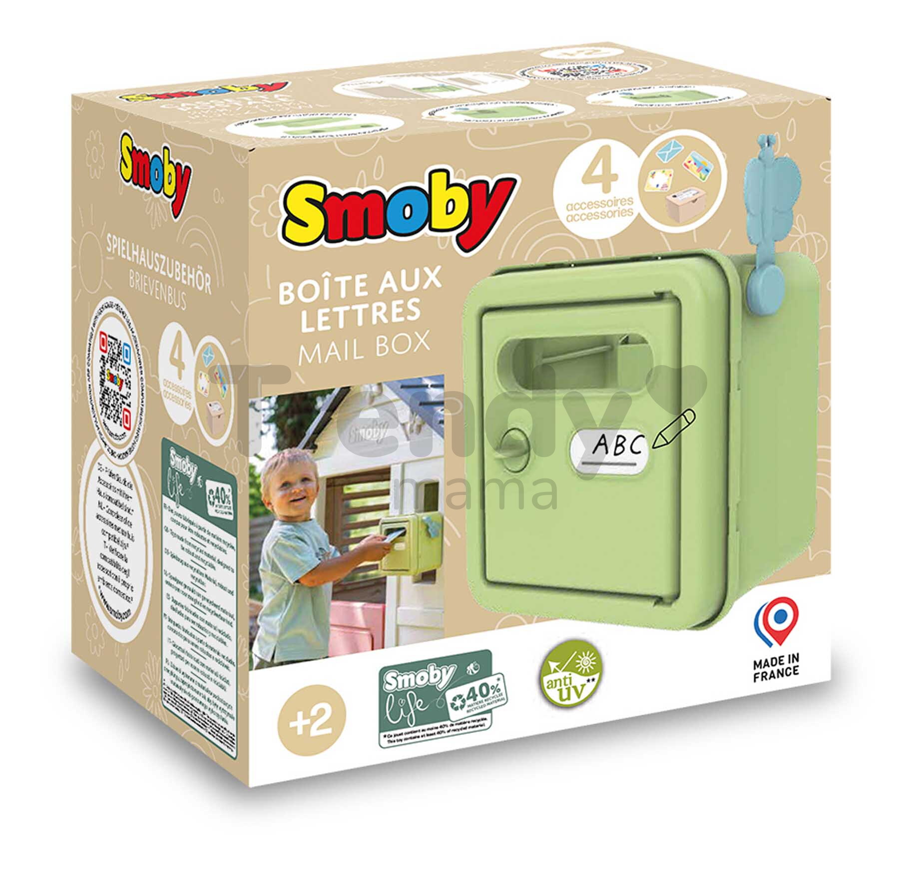 Poštovní schránka Mailbox Life od francouzského výrobce Smoby představuje vynikající doplněk k domečkům Smoby. Zabaví se s ní kluci i holky od 2 let, využijí ji k doručování zásilek a zahrají si na pošťáky. Originální poštovní schránka v zeleném provedení nabídne dětem i 4 doplňky: pohlednici, pozvánku, obálku a balíček, díky nimž získají ještě realističtější zážitky při každodenní hře. Uzavíratelná schránka je vybavena také ozdobou ve tvaru modrého motýlka, který signalizuje, zda se ve schránce nachází pošta. Schránka má v přední části také prostor na jmenovku, na kterou si děti mohou napsat své jméno.