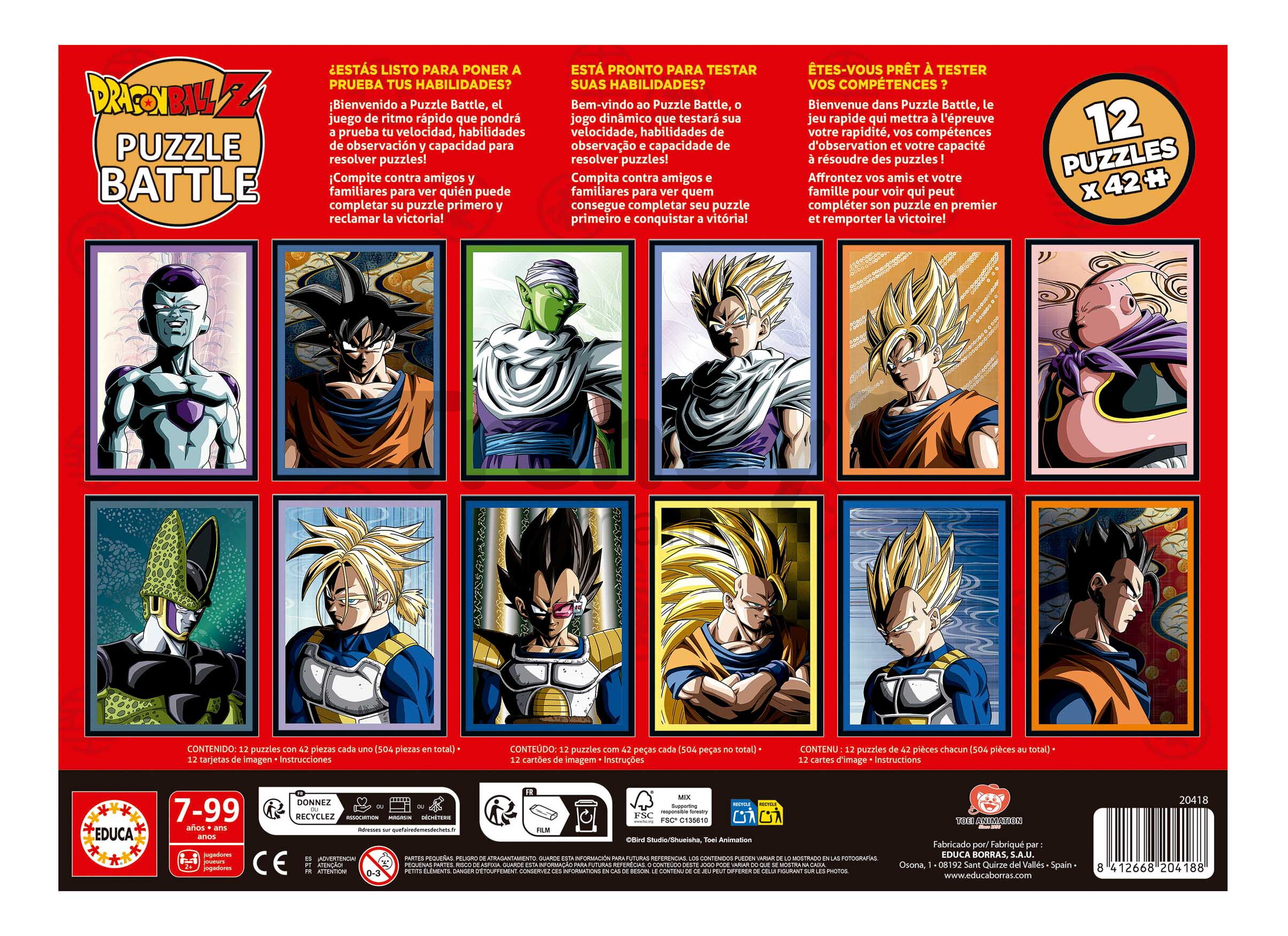 Puzzle battle od španělského výrobce Educa představují perfektní dárek pro děti od 7 let. Celá rodina si může zahrát soutěž ve skládání puzzle a ukázat, kdo je rychlejší, pozornější a šikovnější při vytvoření obrázku v motivem animovaných hrdinů Dragon Ball Z. Při souboji si vyberete, jaký obrázek se rozhodnete poskládat, v balení se nachází až 12 druhů puzzle, přičemž každé puzzle se skládají ze 42 dílků. Před samotným soubojem máte k dispozici také kartičky s obrázky, podle kterých budete puzzle skládat.