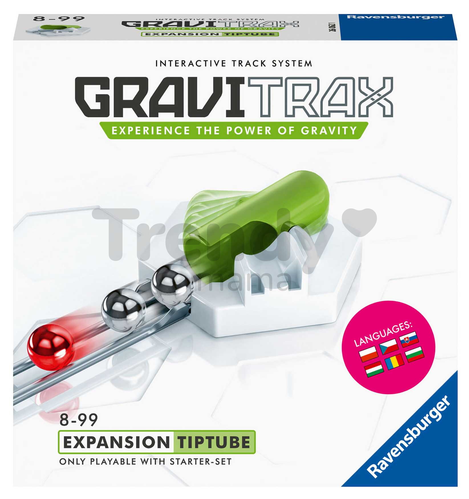 Rozšíření pro kuličkové dráhy Zásobník Tiptube Extension představuje kompatibilní doplněk k základním startovacím soupravám kuličkových drah GraviTrax a GraviTrax PRO. Stavební prvek Zásobník dokáže v sobě shromáždit najednou až 3 kuličky a poté je společně uvolní dále do dráhy ve směru jízdy. Rozšíření Zásobník je vyrobeno z prvotřídních plastů, zaujme dospělé a děti od 8 let. Součástí balení je návod, stavební prvek Zásobník s 1 dlouhou kolejnicí, 2 středními kolejnicemi a 3 krátkými kolejnicemi.