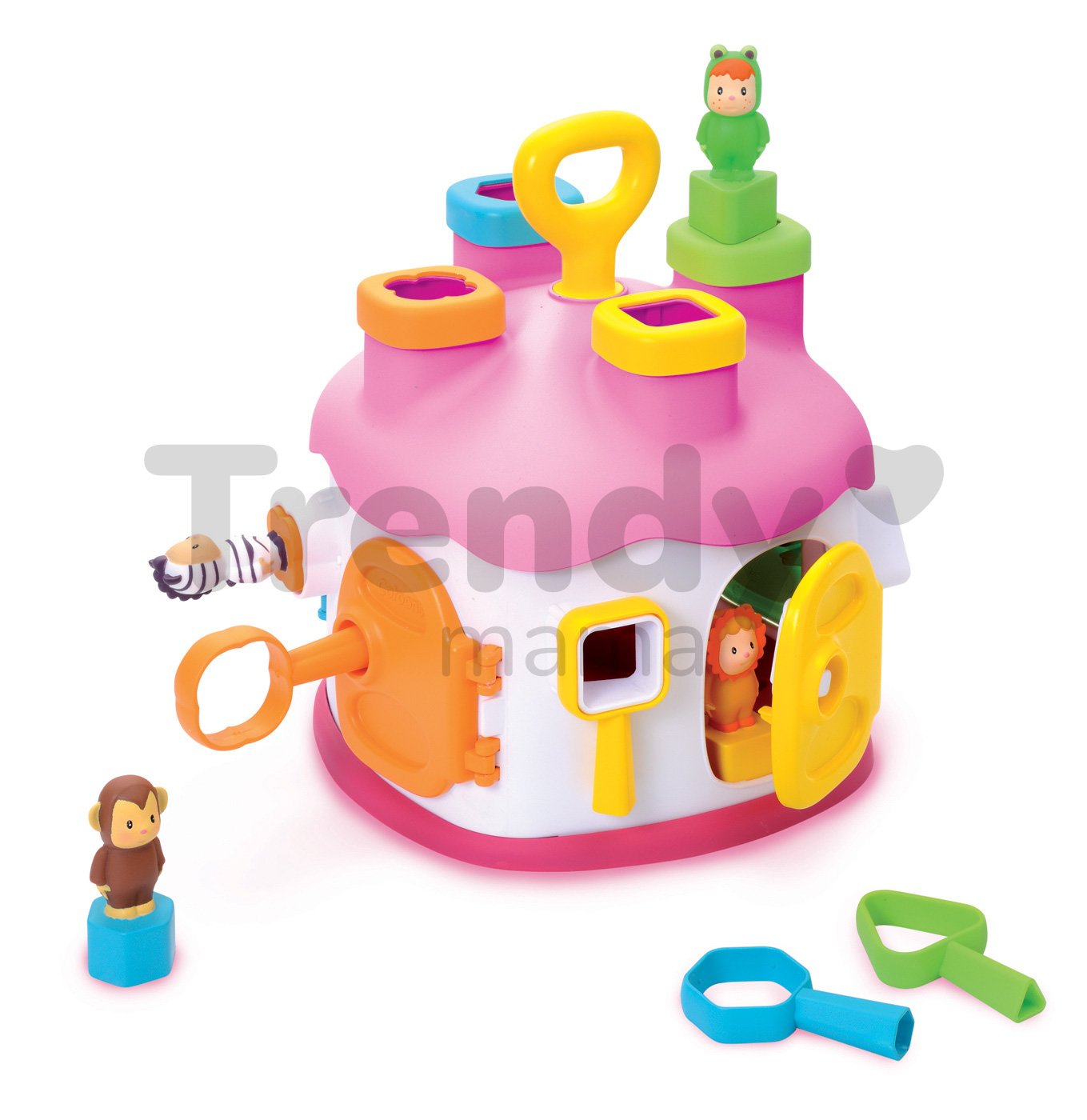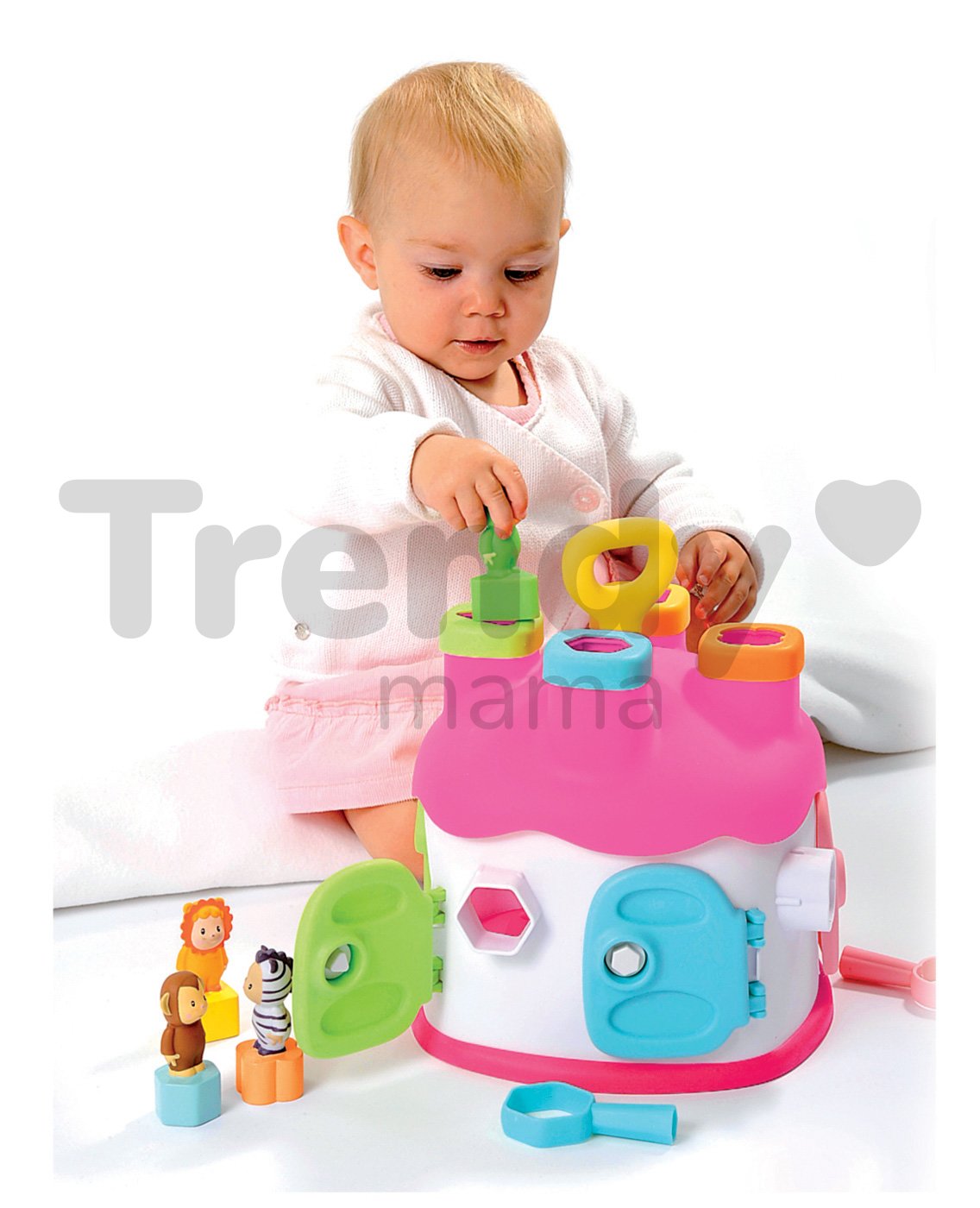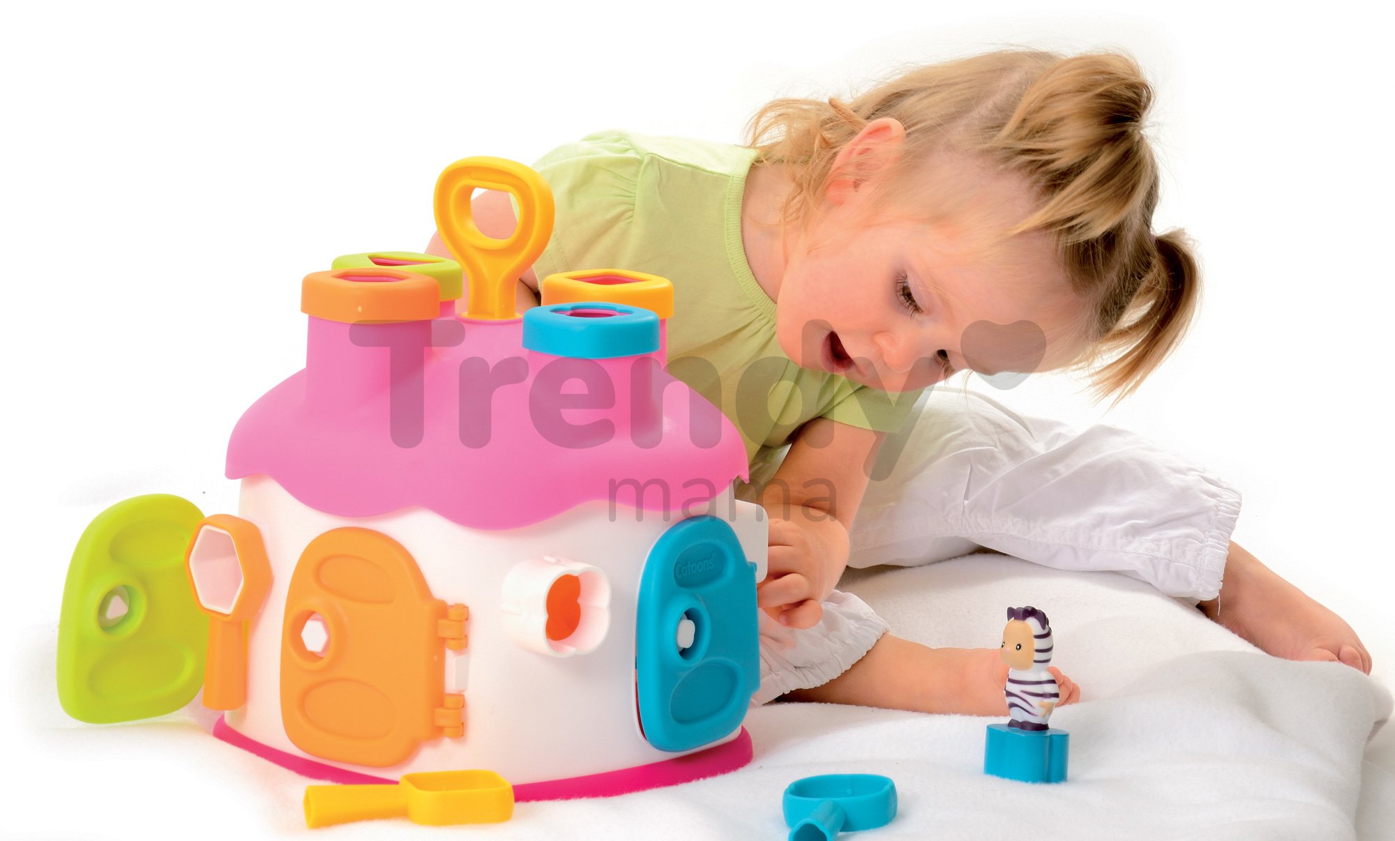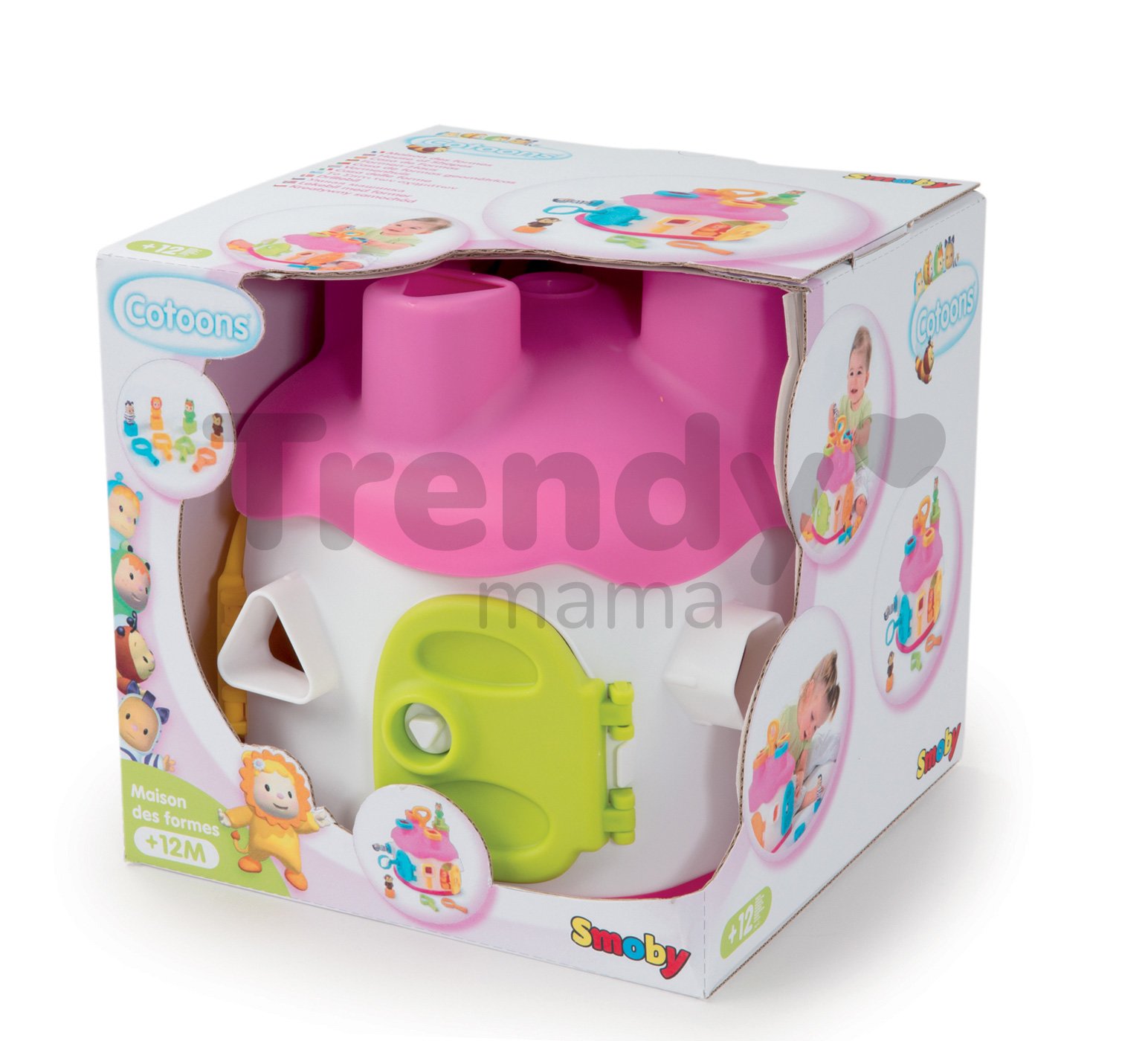 SMOBY vkládací domeček s figurkami a barevnými klíči je úžasná didaktická hračka pro děti od 12 měsíců. Domek je proveden v pěkné barevné kombinaci s dominantní svěží růžovou barvou se zelenými a modrými dvířky a figurkami Cotoons, které jsou u dětí velmi oblíbené. Domeček pro děti se vkládacími otvory má 4 komíny. V každém z nich otvor jiného tvaru a barvy. Dítě ví tvarově a podle barvy rozhodnout kam která figurka patří. Děti si rozvíjejí jemnou motoriku a učí se rozeznávat tvary a barvy a přitom rozvíjejí logické myšlení a představivost. Do jednotlivých otvorů na střeše domku vkládají figurky a kostky, podle jejich tvarů, a pak je přes dvířka vyberou zpět a hra může začít znovu.