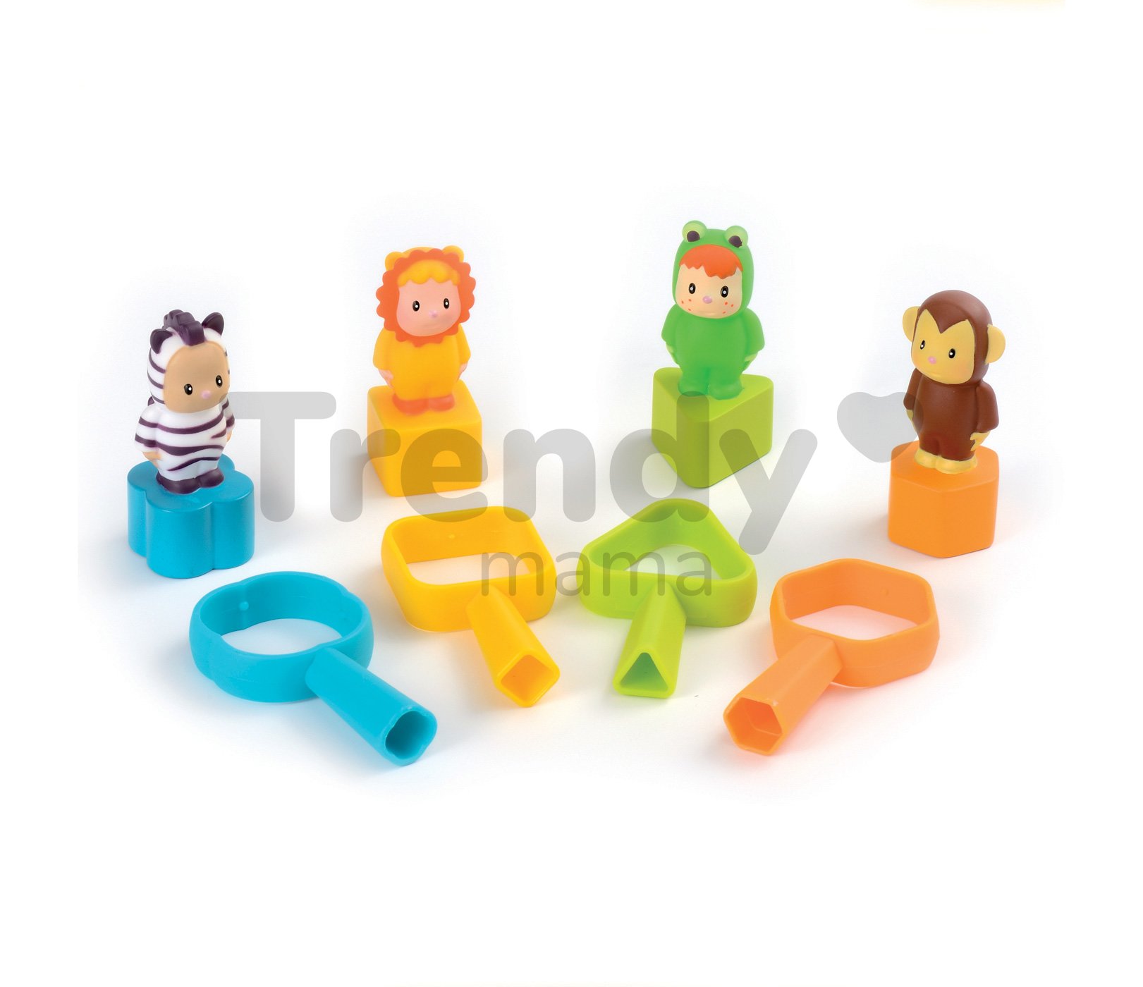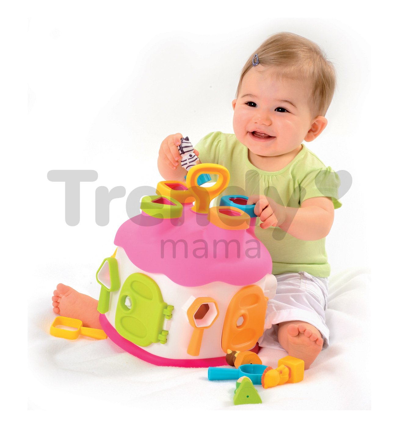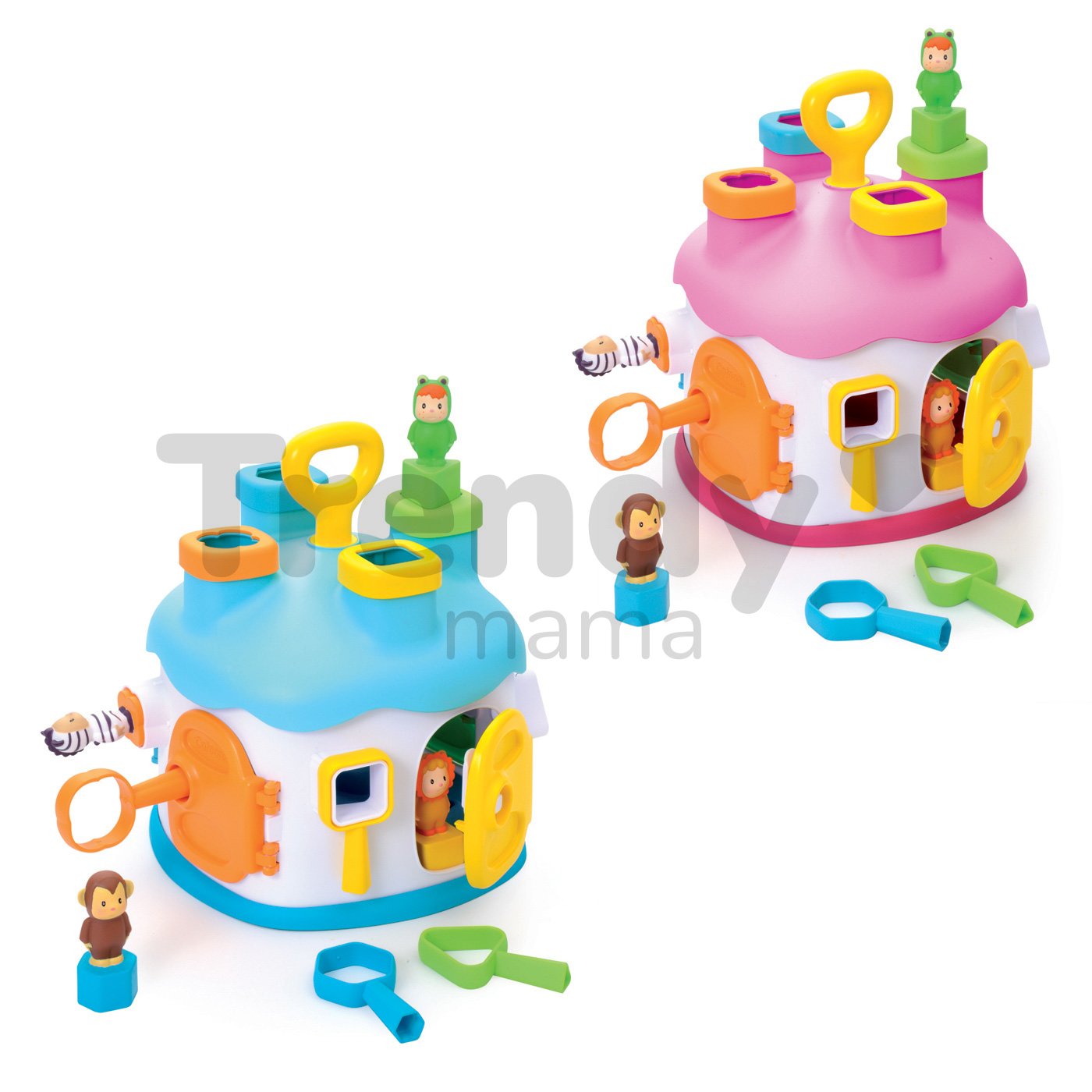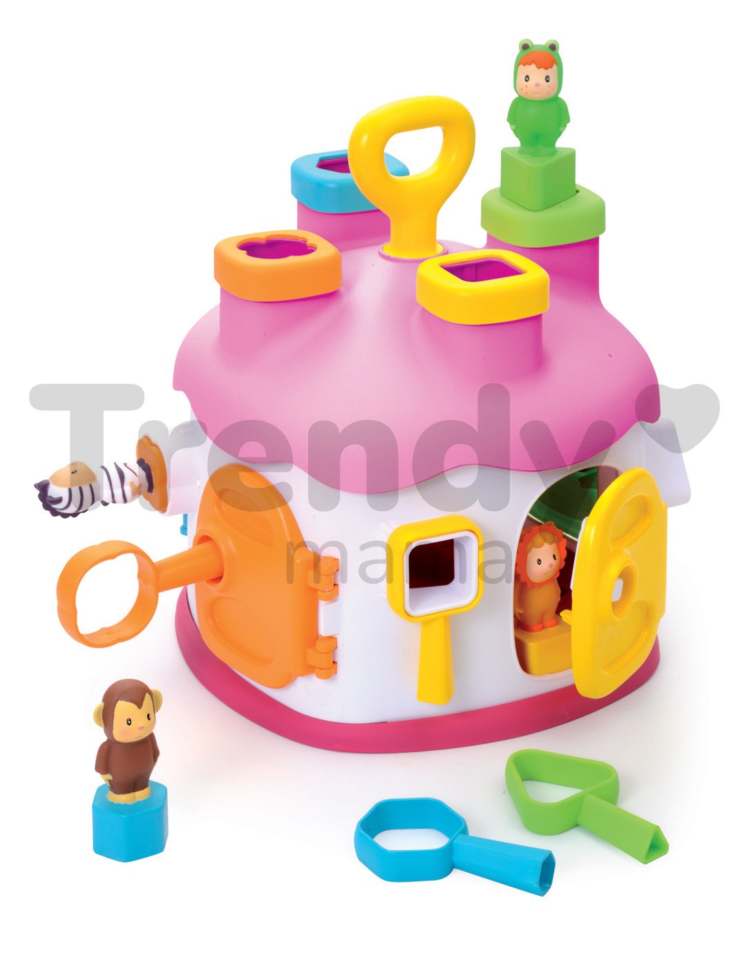 SMOBY vkládací domeček s figurkami a barevnými klíči je úžasná didaktická hračka pro děti od 12 měsíců. Domek je proveden v pěkné barevné kombinaci s dominantní svěží růžovou barvou se zelenými a modrými dvířky a figurkami Cotoons, které jsou u dětí velmi oblíbené. Domeček pro děti se vkládacími otvory má 4 komíny. V každém z nich otvor jiného tvaru a barvy. Dítě ví tvarově a podle barvy rozhodnout kam která figurka patří. Děti si rozvíjejí jemnou motoriku a učí se rozeznávat tvary a barvy a přitom rozvíjejí logické myšlení a představivost. Do jednotlivých otvorů na střeše domku vkládají figurky a kostky, podle jejich tvarů, a pak je přes dvířka vyberou zpět a hra může začít znovu.