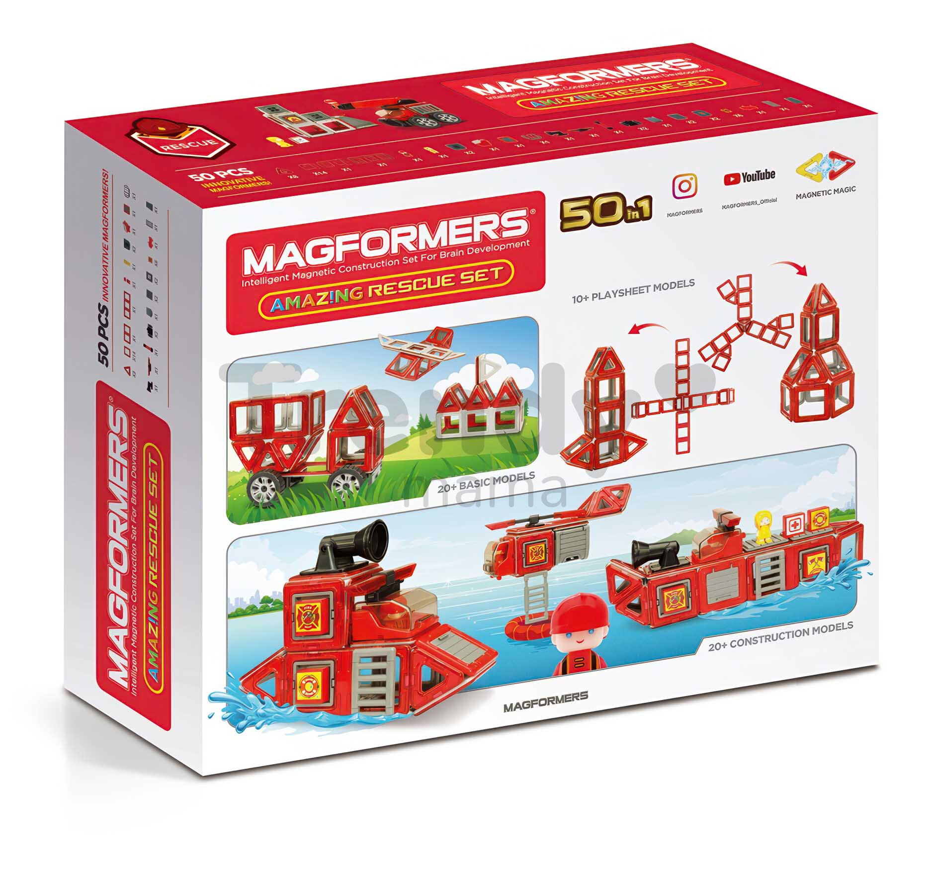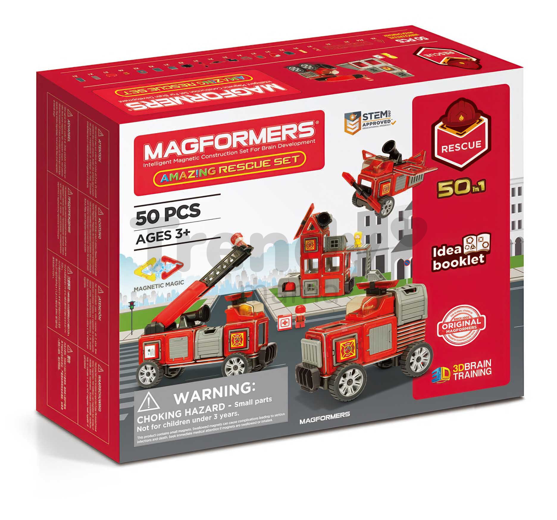 Magnetická stavebnice Hasičská stanice Amazing Rescue Set Magformers z kolekce Rescue představuje prvotřídní stavebnici pro chlapce a dívky od 3 let. Originální 50dílná stavebnice je vybavena dílky různých tvarů se silnými vnitřními magnety, které se navzájem přitahují a rychle se spojují. Děti se naučí postavit hasičskou stanici a různá vozidla, s kvalitními dílky děti vytvářejí 2D i 3D konstrukce, naplno se ponoří do světa fantazie a představivosti. Při kreativním tvoření si zlepšují jemnou motoriku, logické myšlení a rozvíjí prostorové vidění. Hravou formou se zároveň učí rozeznávat barvy a učí se základy geometrie.