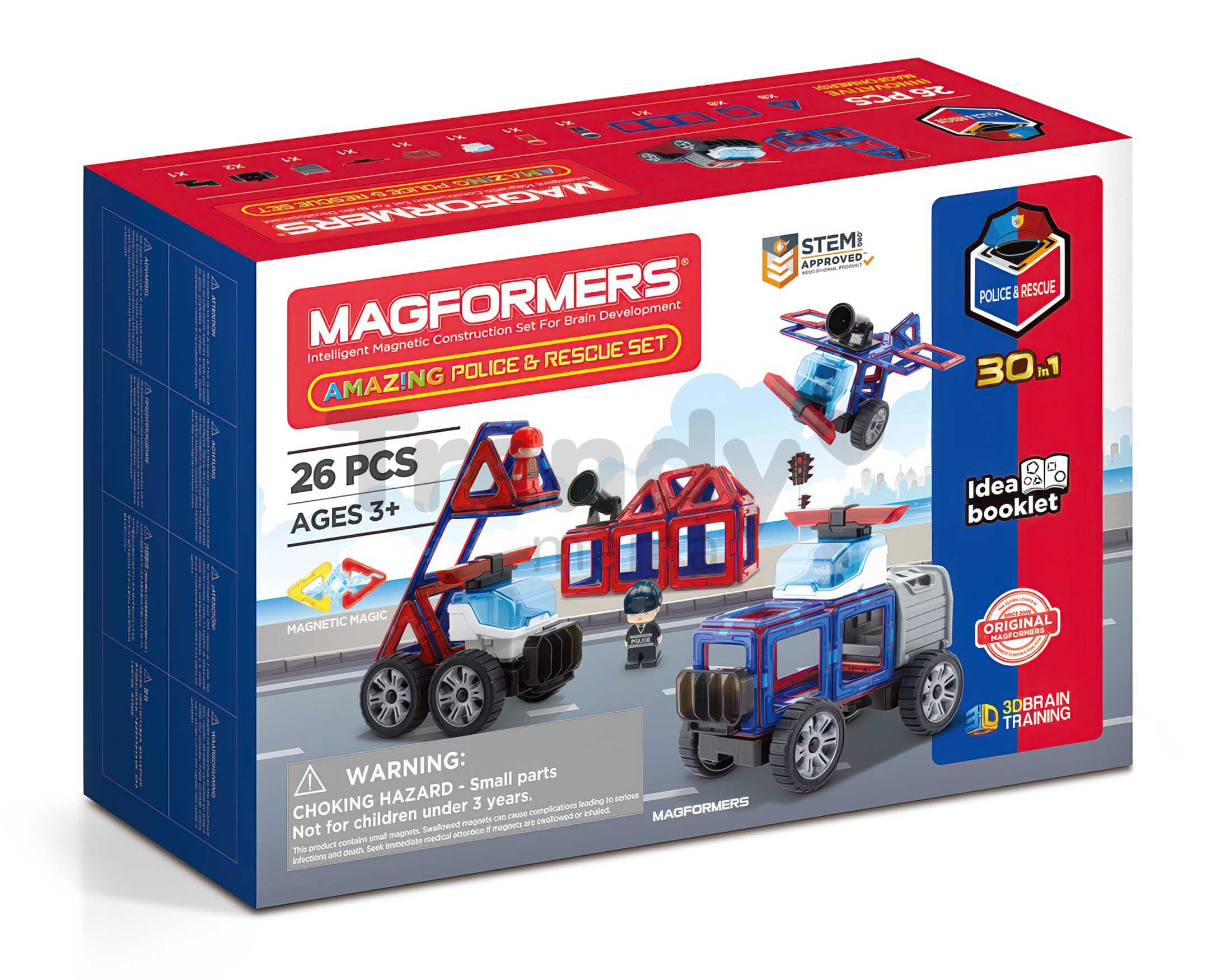 Originální magnetické stavebnice od značky Magformers. Magnetická stavebnice s 26 dílky pro stavbu policejní stanice a záchranných složek potěší děti od 3 let.