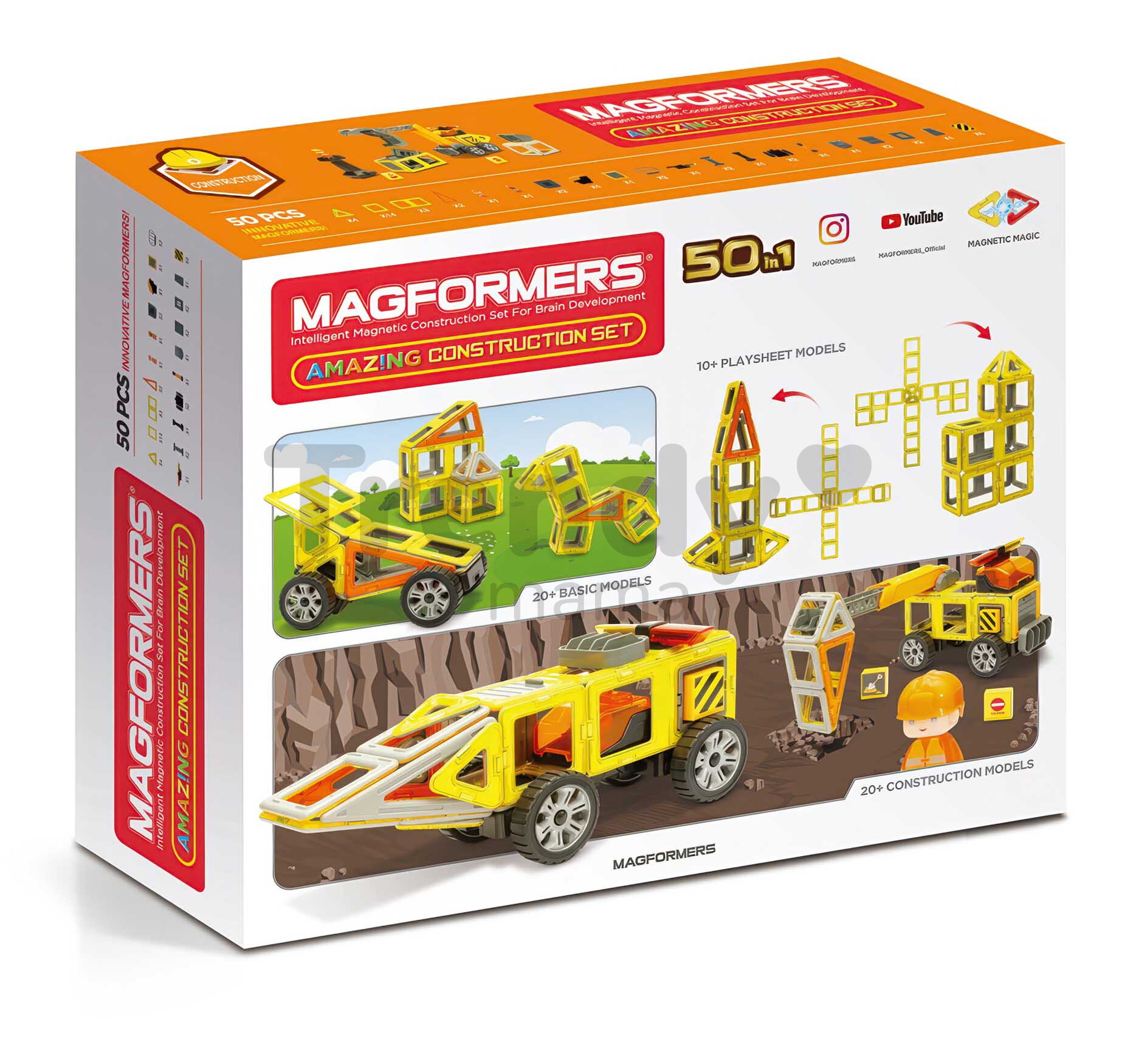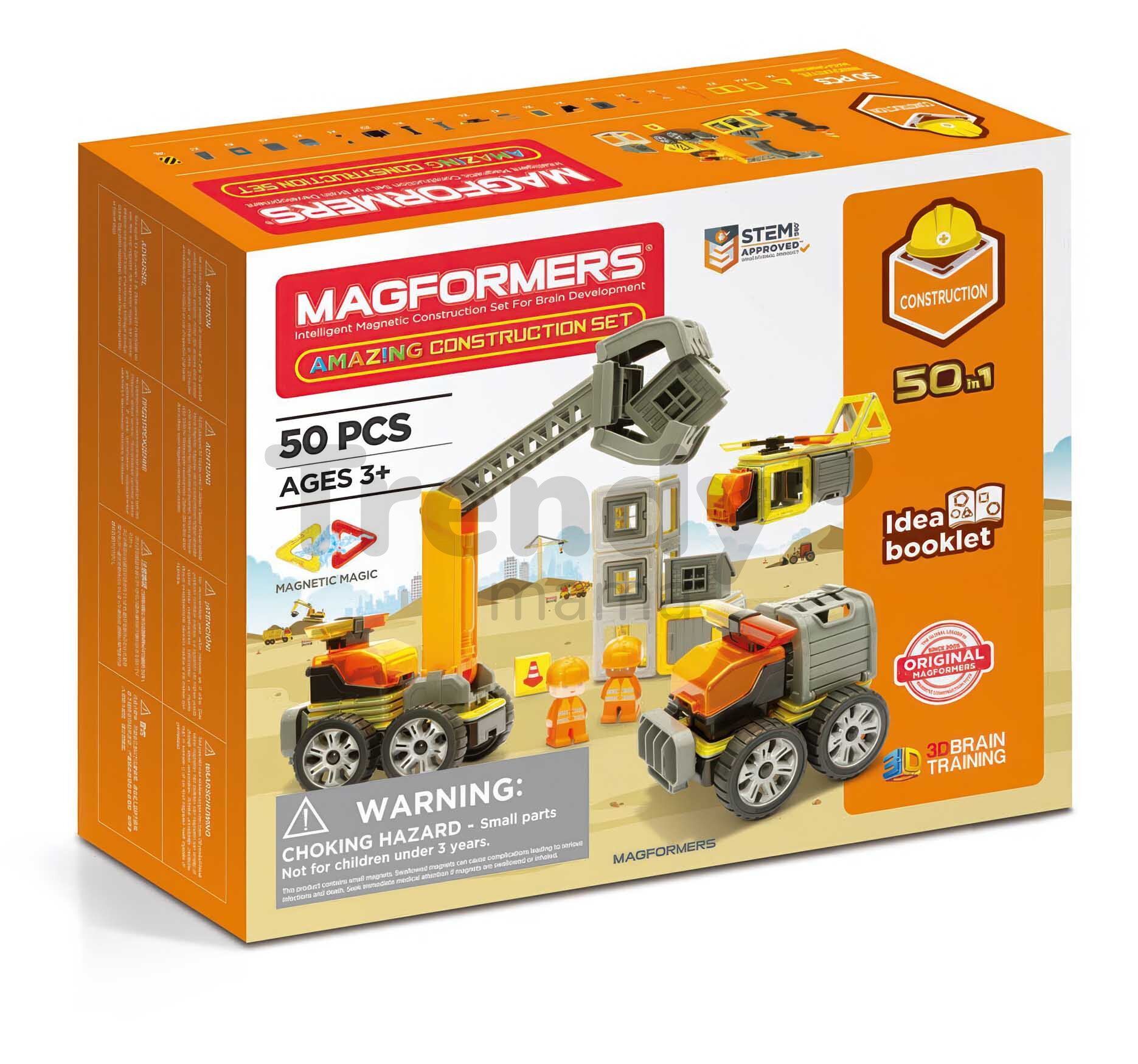 Magnetická stavebnice Stavební stroje Amazing Construction Set Magformers z kolekce Construction představuje špičkovou stavebnici pro chlapce a dívky od 3 let. Moderní 50dílná stavebnice je vybavena dílky různých tvarů se silnými vnitřními magnety, které se navzájem přitahují a rychle se spojují. Děti se naučí postavit stavební vozidla, s kvalitními dílky děti vytvářejí 2D i 3D konstrukce, naplno se ponoří do světa fantazie a představivosti. Při kreativním tvoření si zlepšují jemnou motoriku, logické myšlení a rozvíjí prostorové vidění. Hravou formou se zároveň učí rozeznávat barvy a učí se základy geometrie.