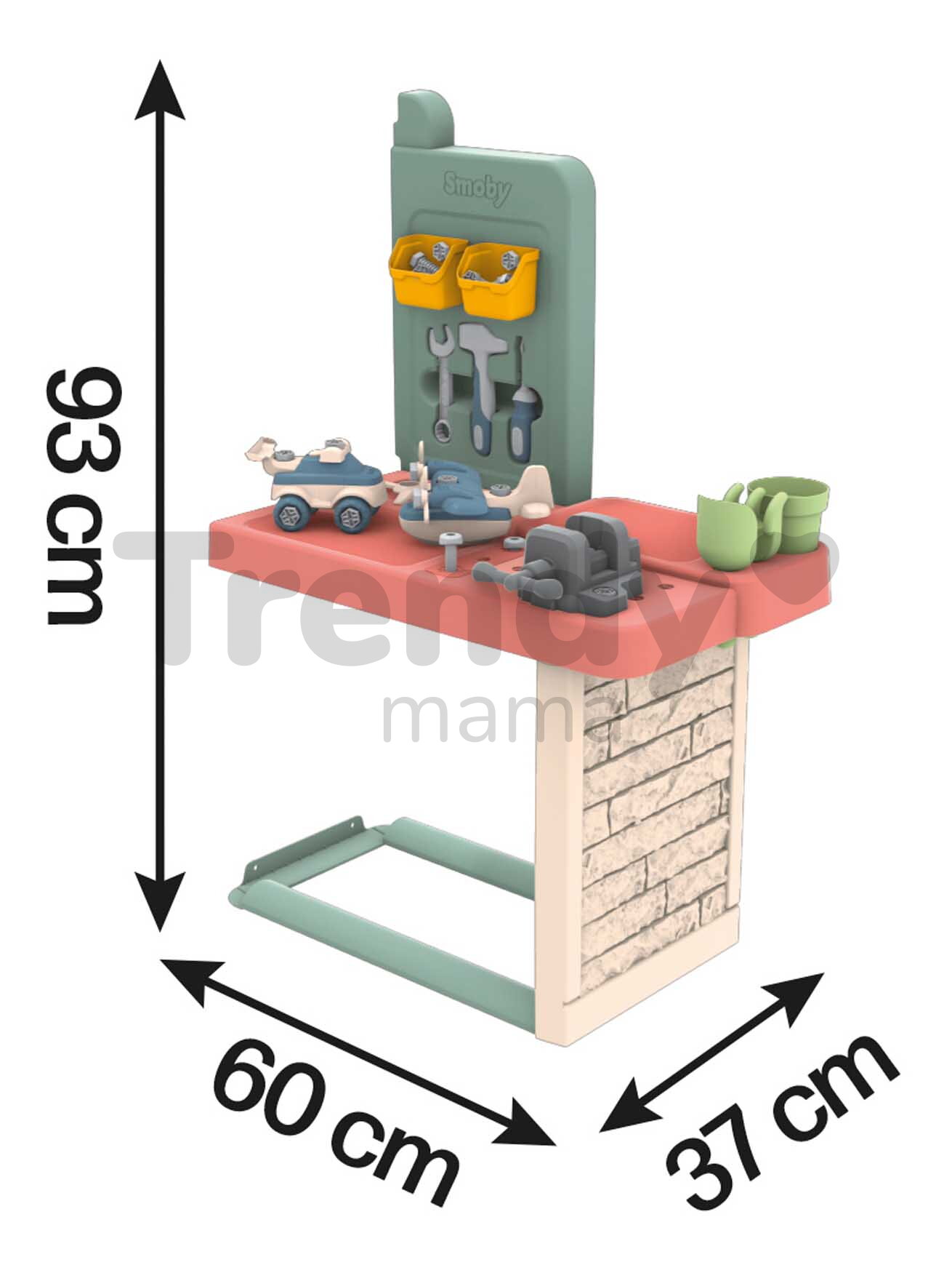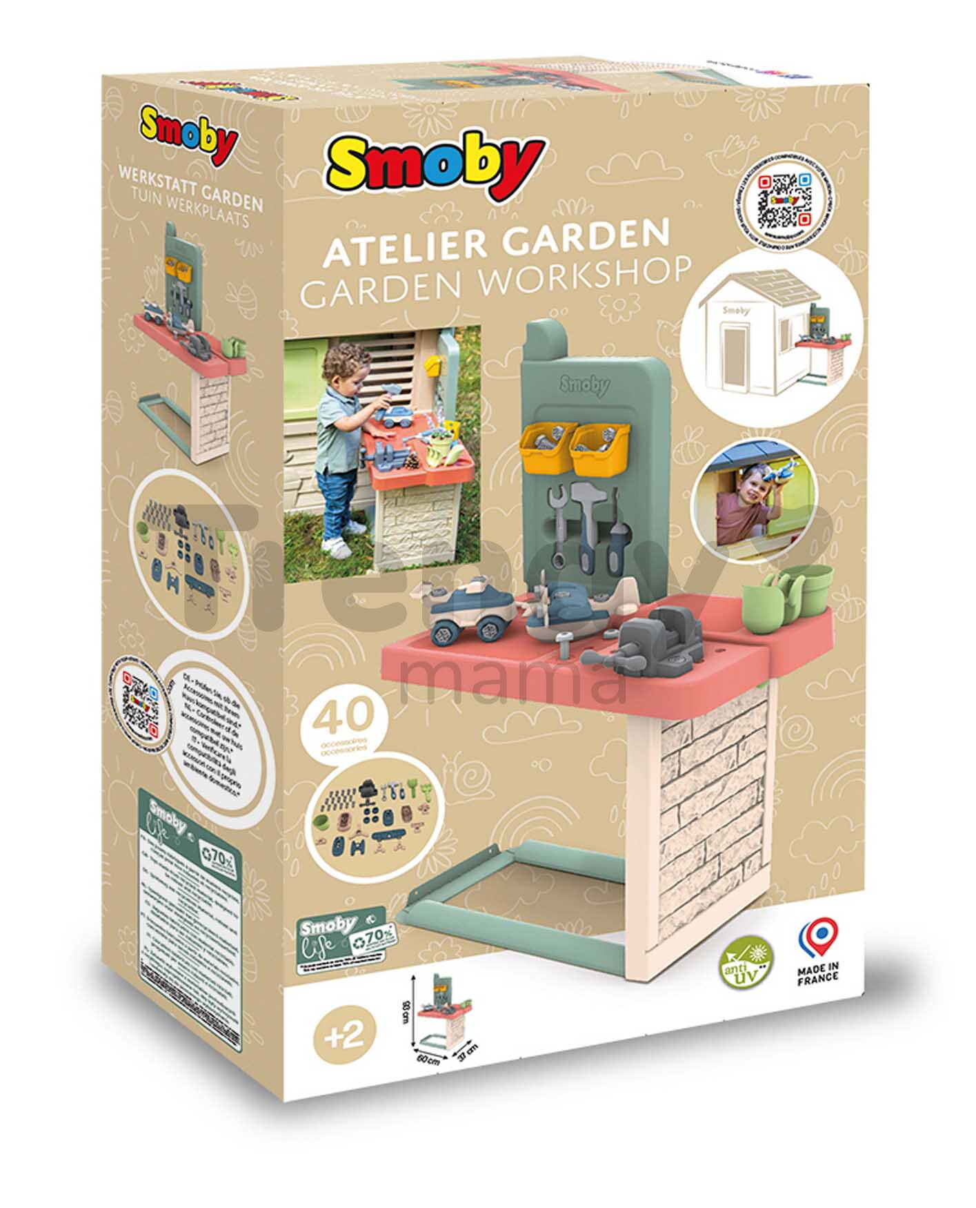 Pracovní dílna s 39 doplňky Garden Workshop od francouzského výrobce Smoby představuje skvělé rozšíření k dětským domečkům Smoby. Potěší všechny děti a zejména kluky od 2 let, kteří ji využijí při hře na konstruktéry a opraváře. Dětská pracovní dílna je vybavena stěnou na nářadí s otvory pro montážní klíč, kladivo a šroubovák, děti potěší i žluté boxy na drobné součástky. Praktická pracovní deska je vybavena montážními otvory, svěrákem na přichycení součástek a odkládacím prostorem pro hrábě, lopatku a plastový květináč, ve kterém si mohou holčičky vypěstovat květiny.