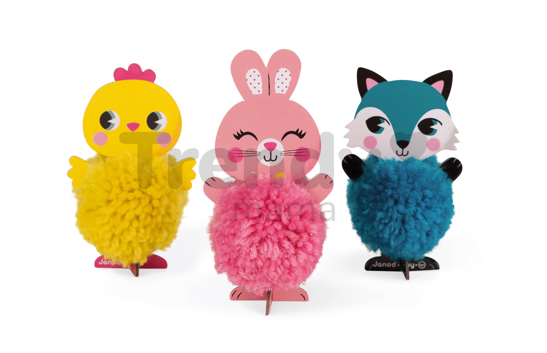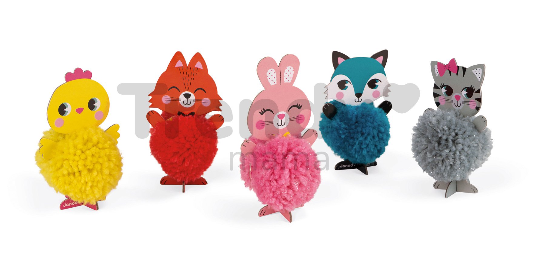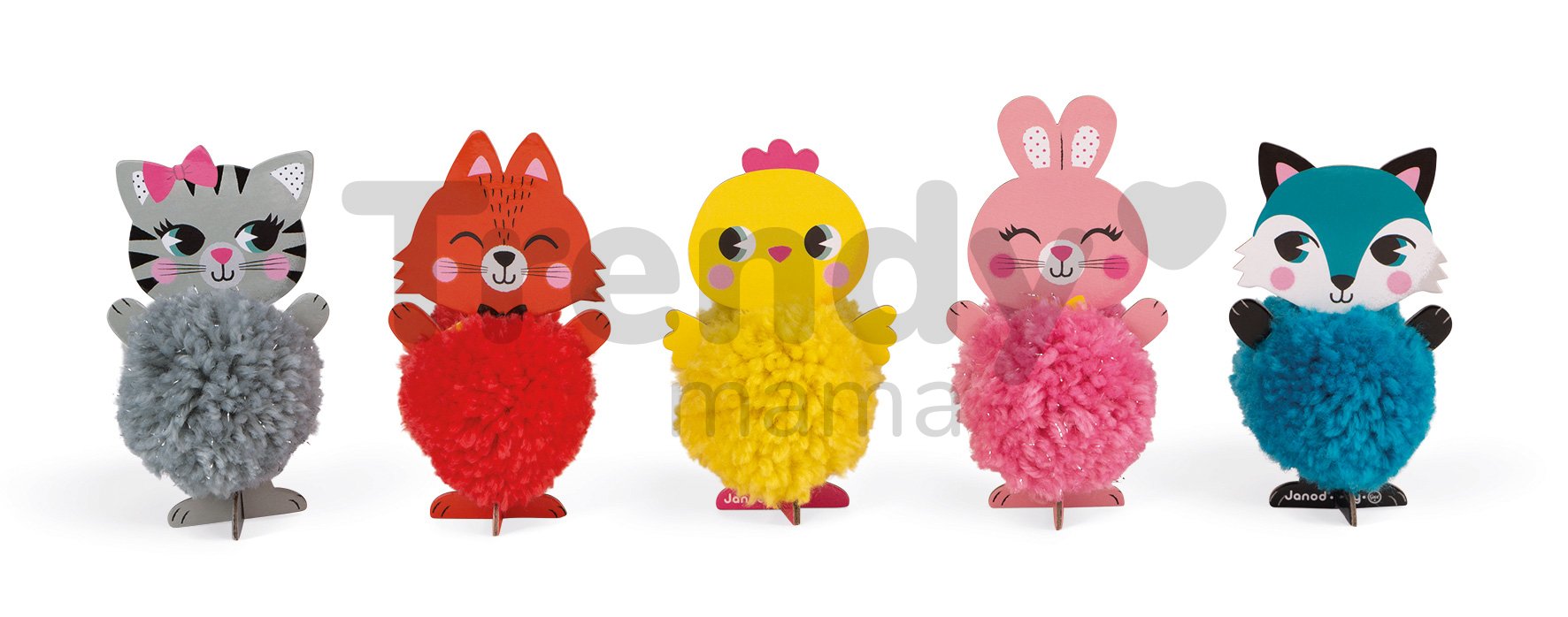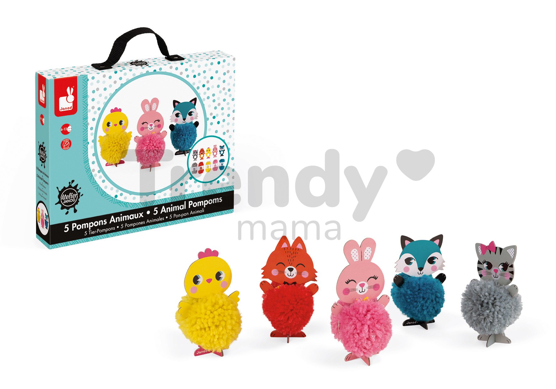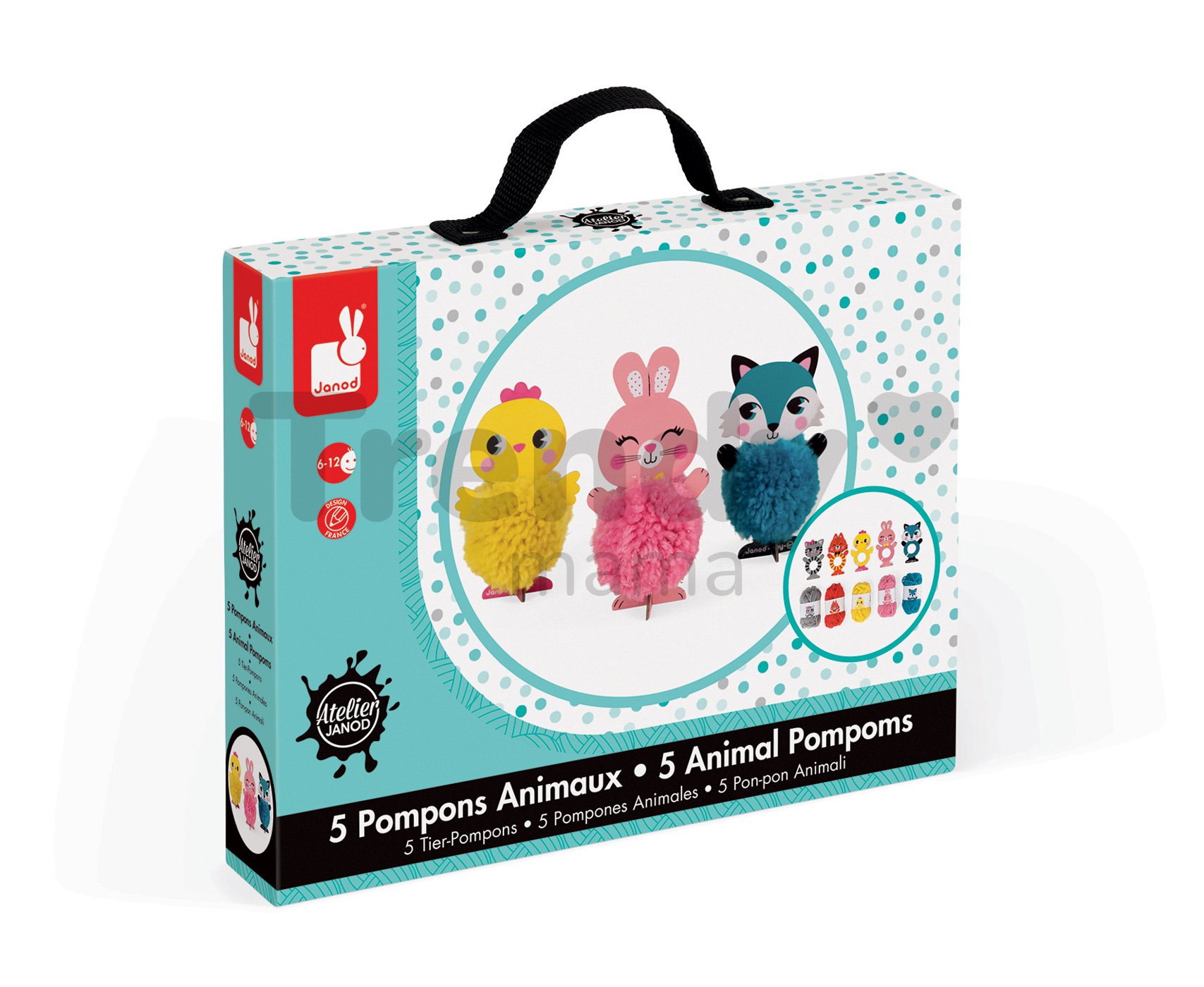Dětská zvířátka z vlny Pompoms Ateliér Janod jsou kreativní sada pro děti od 6 do 12 let. Zvířátka jsou uložena v praktickém kufříku, díky kterému budou mít děti svá zvířátka u sebe i o prázdninách. Kreativní sada na výrobu vlněných zvířátek obsahuje 5 kartónových zvířátek a 5 klubek vlny (dvě z nich mají stříbrná vlákna). Vlastnoručně vyrobená zvířátka jsou krásná hračka a zároveň dekorace. Rozměry jednoho zvířátka jsou přibližně 5*6*12 cm.